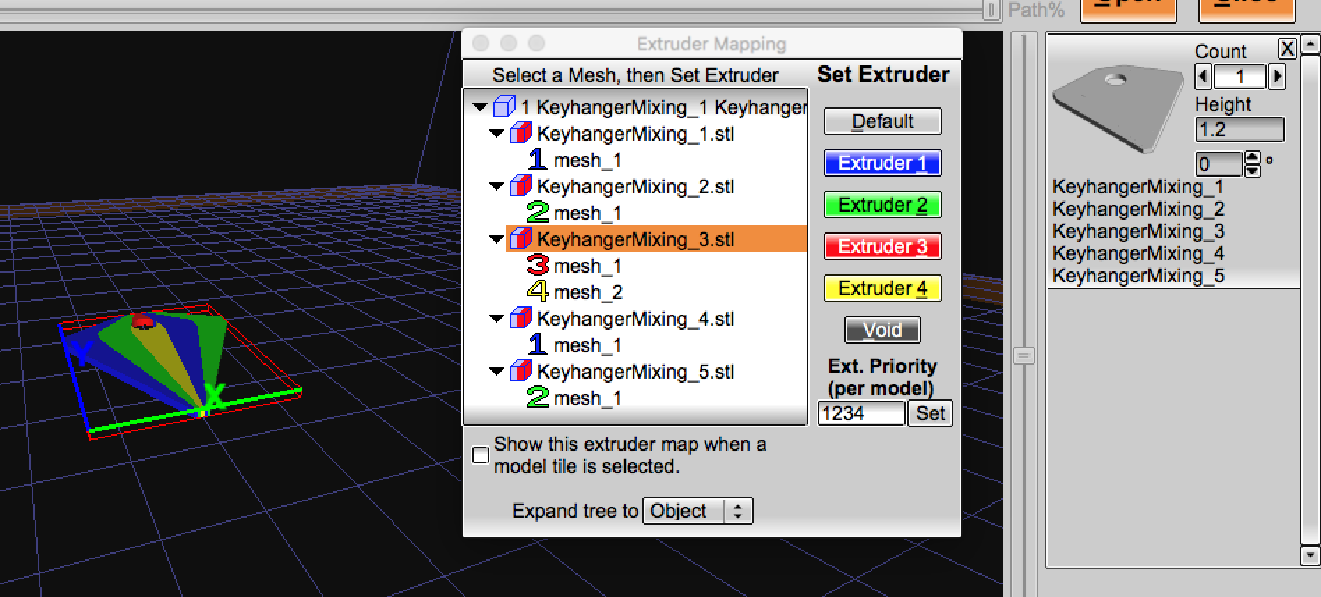 далее загружаете модель состоящую из нескольких цветов (это может быть один файл из нескольких поверхностей или несколько файлов) и из меню мапим цвета: