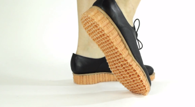 Проект называется 3D Waver. Из ниток плетется воздушная структура нужной формы. Потом эта структура погружается в силикон и на выходе получаем гибкий, пружинящий материал. Из которого можно сделать например подошву обуви.