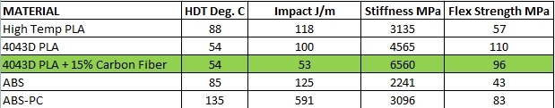 Углеволокно составляет 15% по весу. Материал очень жесткий - в 1.5 раза жестче чем PLA, почти в 3 раза жестче чем ABS. Но хрупкий. Можно печатать на холодный стол как обычный PLA.