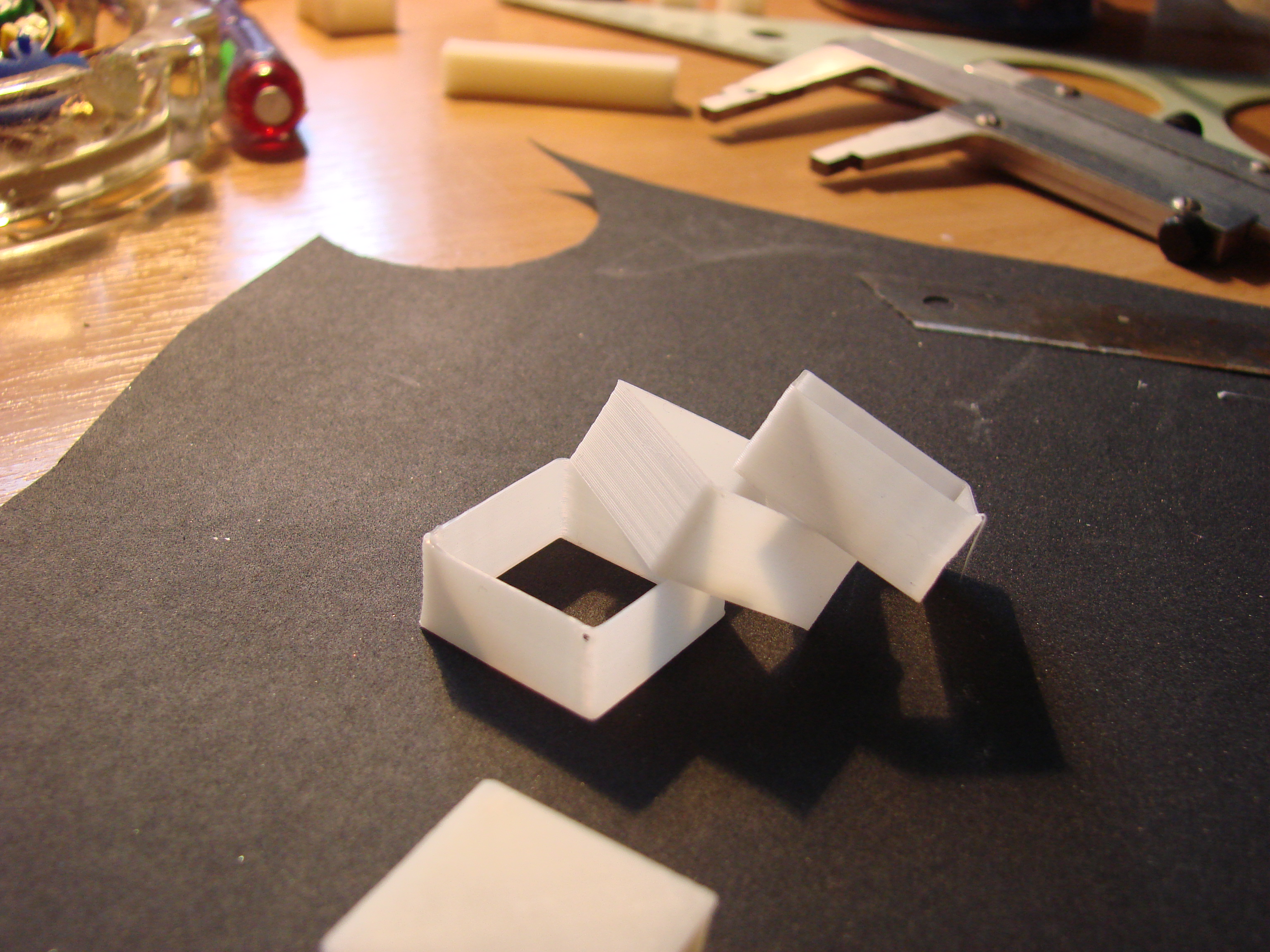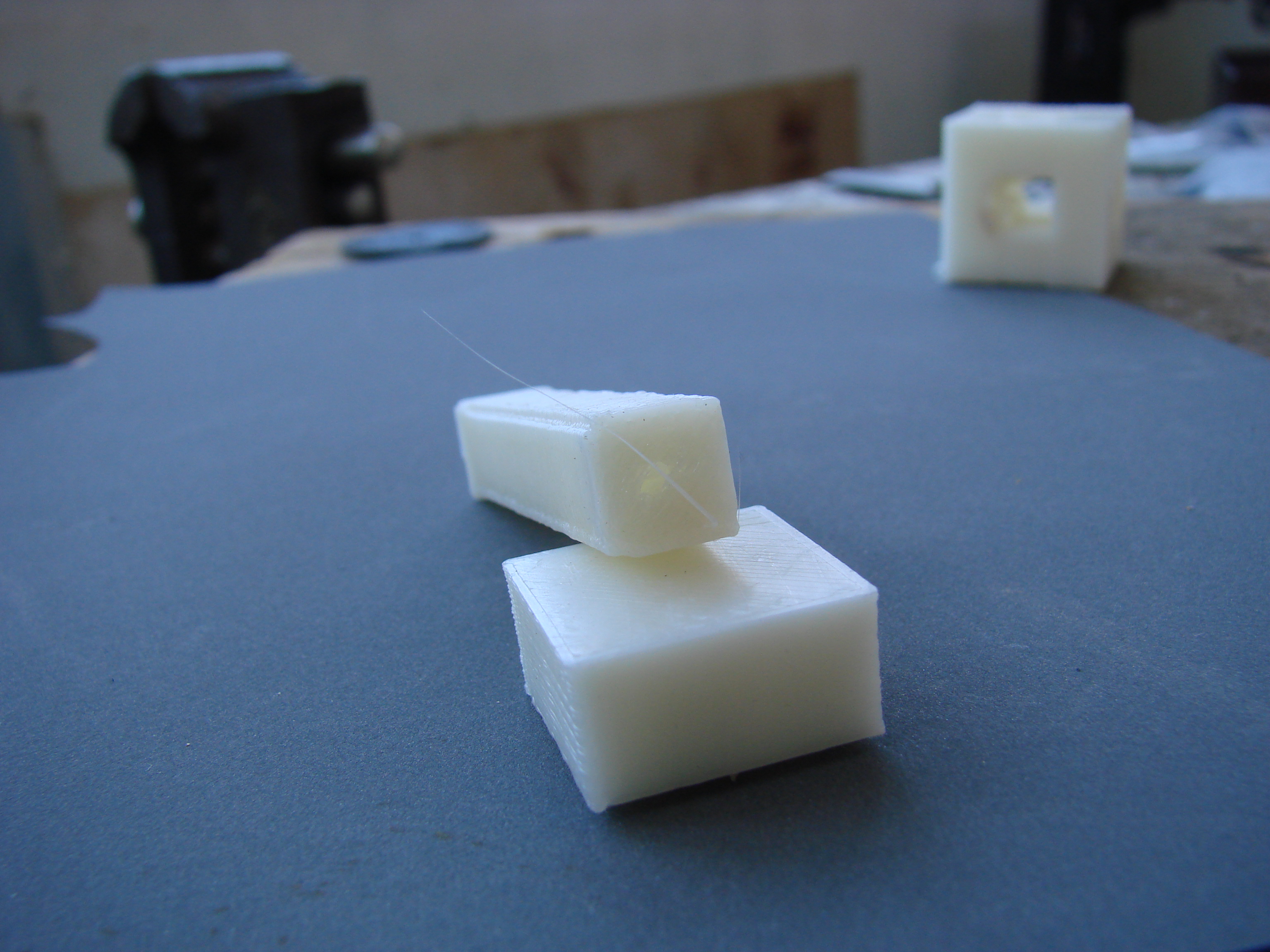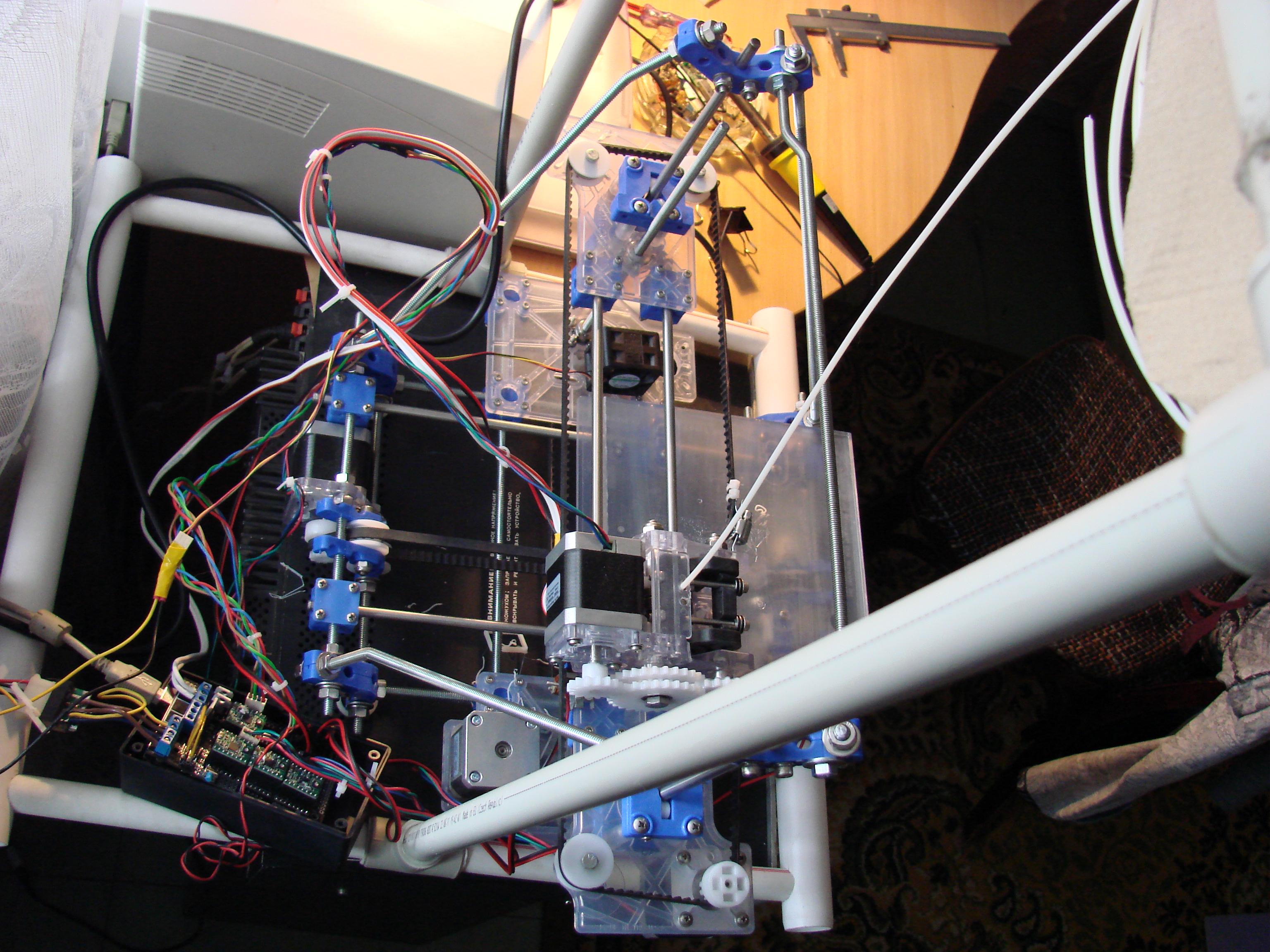 4 Сборка прошла без эксцессов с обычными матюками и прочими заклинаниями. Выяснилось что "подшипники" кареток себя не оправдывают - пластиковые ролики не устраняют люфт подвижных частей. Были злобно пофиксены кусками фторпласта. Ролики ремней под нагрузкой начинают рывками крутиться и скрипеть. Замены на обычные подшипники 20мм и шириной 6мм (как раз ремень такой ширины) Шаговики надо привинчивать до сборки иначе хрен потом привинтишь. Отверстия можно расширить чтоб в случае снятия шаговика на надо было спрессовывать шестерню.
