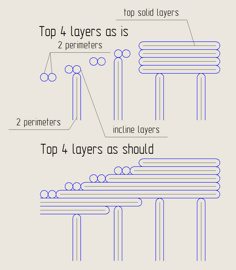 Получается, что боковые стенки у нас получаются в количество периметров, а наклонные - количество периметров на косинус угла наклона стенки от вертикальной. Т.е. при этом толщина стенки при угле близком к 90 градусам будет стремиться к нулю. Ей этого не будет позволять только минимальная толщина сопла и слоя... Максимальная тощлина сильно наклоненной стенки будет равняться в лучшем случае толщине слоя. Написать бы разрабам, но я так и не понял, где... На репрапе тему создал.