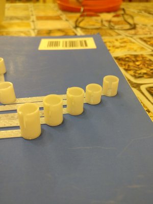 Титан аэро, директ. Пластик АБС ФДпласт, натуральный. Экструдер откалиброван, по команде давит ровно 100 мм. Температура откалибрована: наименьшая, когда есть нормальная спекаемость слоев, 238С. pVE откалиброван, 0.64, фото калибровочного кубика прилагаю. Скорость pVE 5 мм/сек. Для калибровки ретракта поставлена скорость ретракта 20 мм/сек. Столбики диаметром 10 мм, расстояние между центрами 43 мм. СТОЛБИКИ ПЕЧАТАЮТСЯ В ОДИН ПЕРИМЕТР. Ретракт внизу=0 мм, на высоте 15 мм - ретракт=10 мм.(На ПЛА у меня ретракт 0.6 мм и скорость его 6 мм/сек)