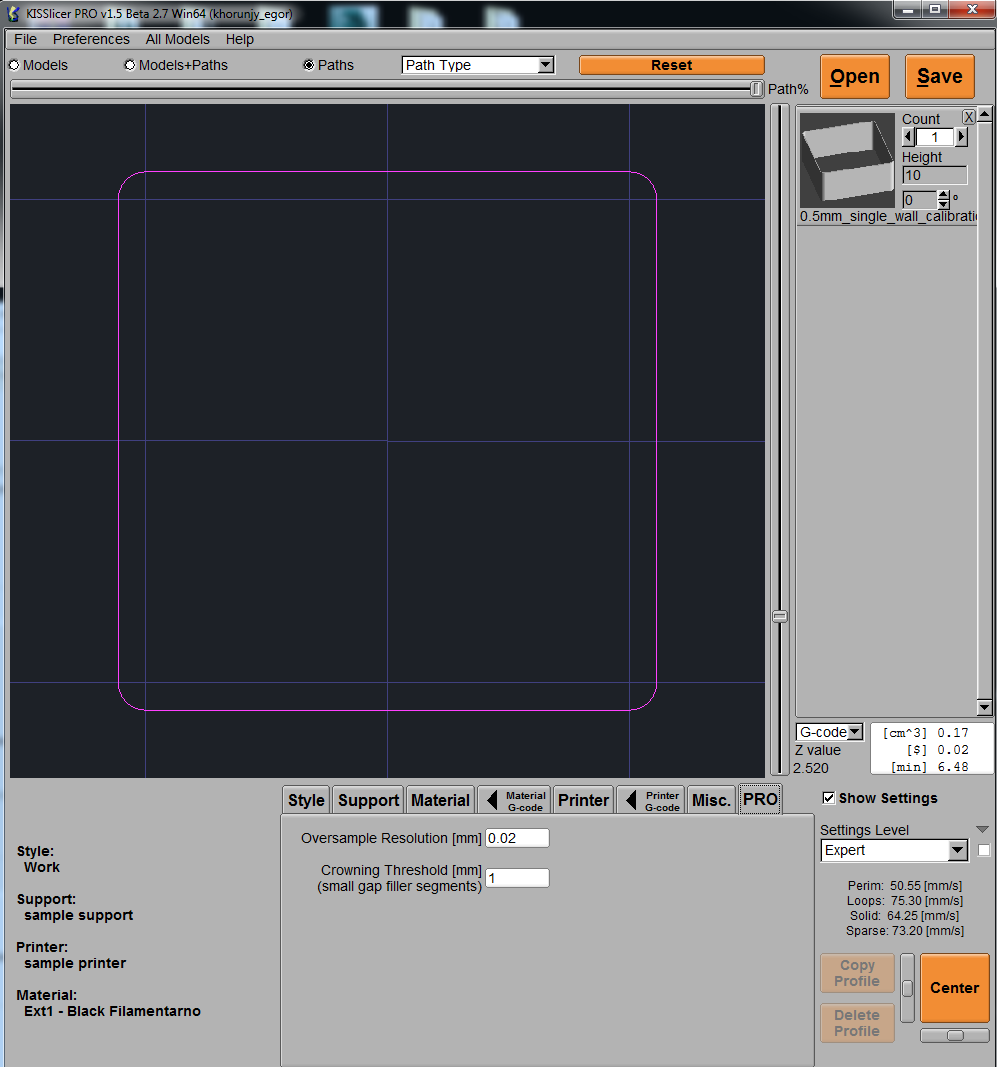 В итоге, после нарезки получиться один периметр в виде квадрата, толщина стенок которого будет равна реальной толщине экструзии.