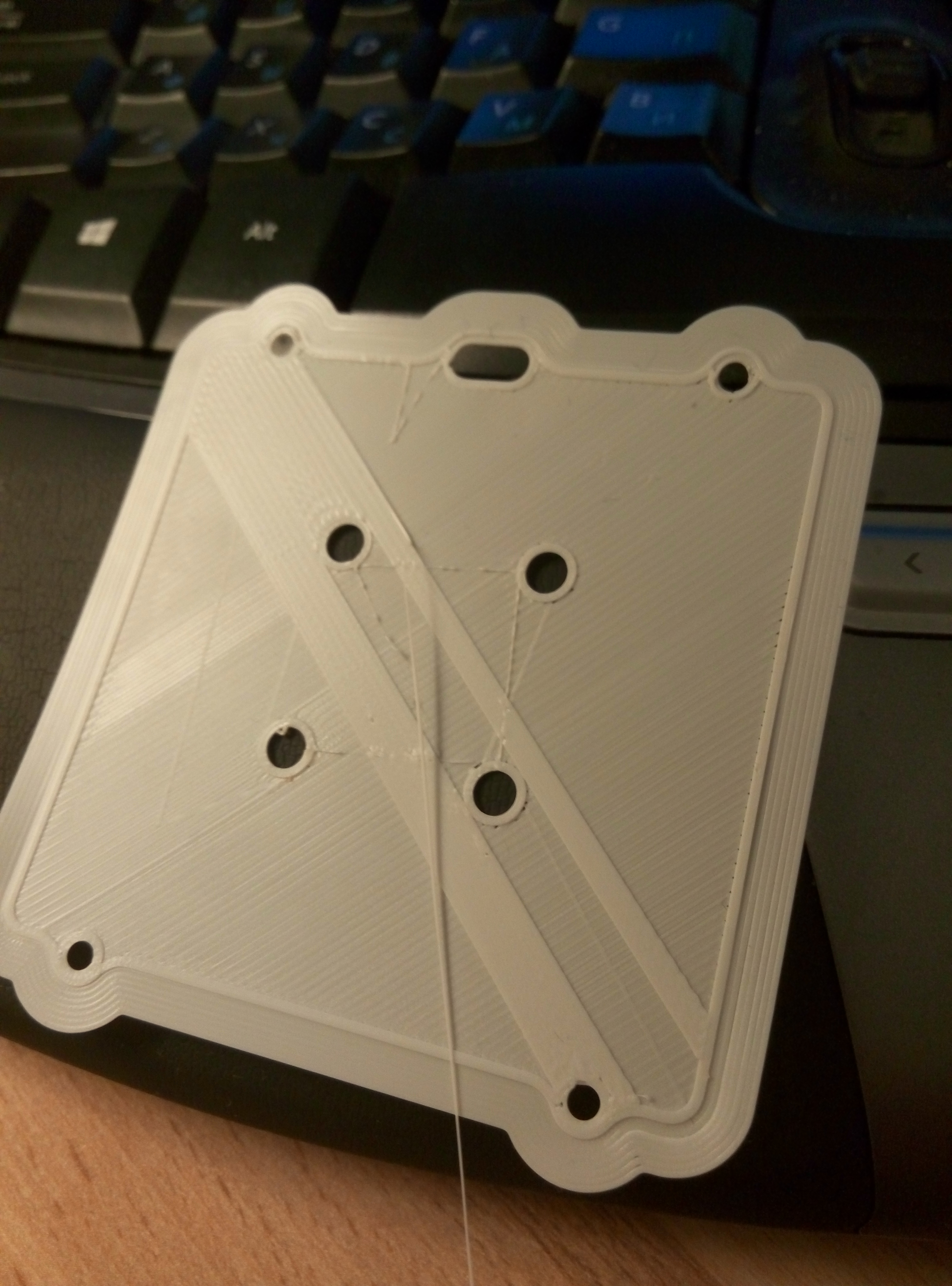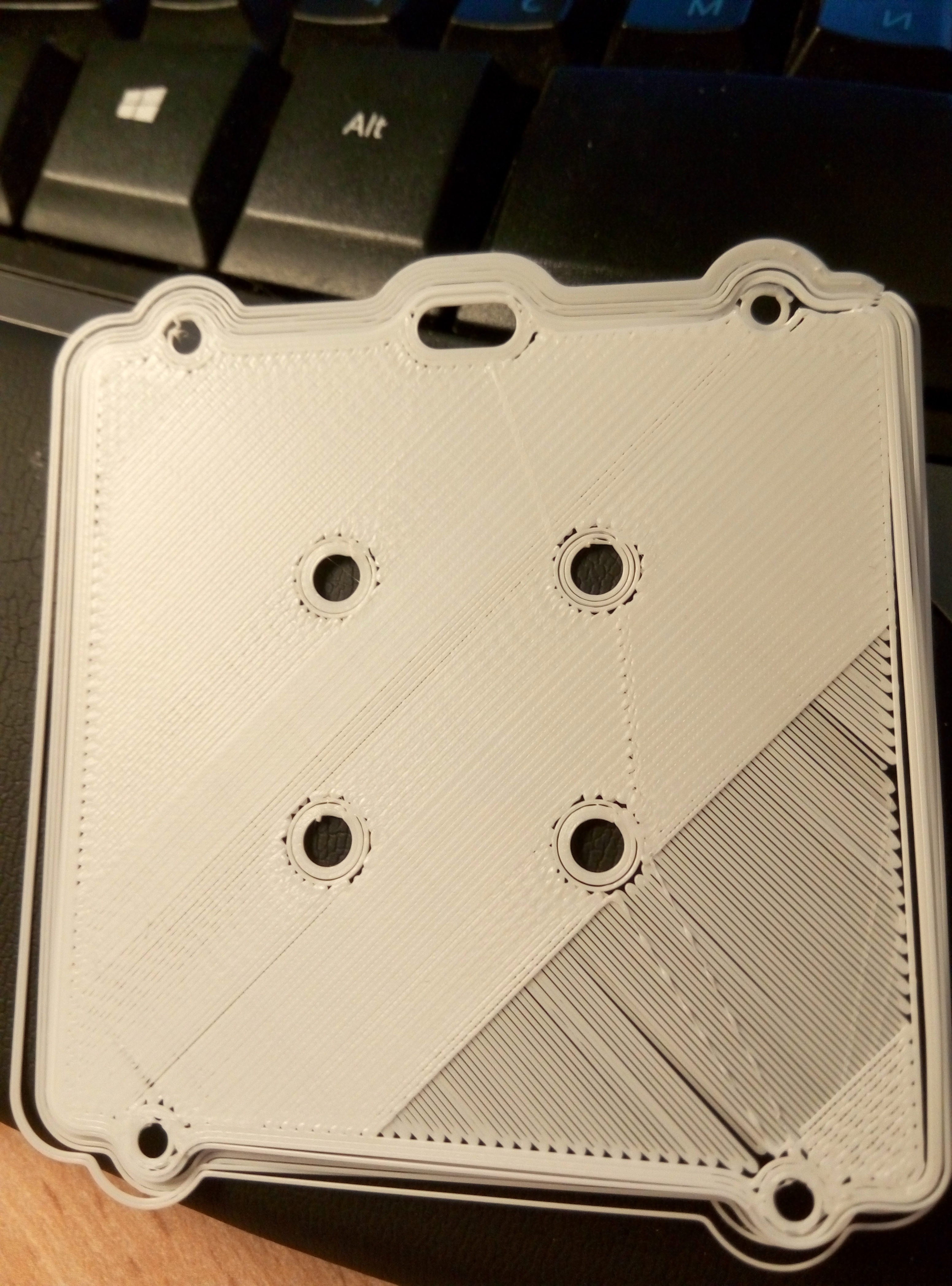 В модели в плоскости печати делайте скругление на углах хотя бы 1 мм. Полезно от наплывов по углам (сопло не останавливается как на прямом углу) и от отлипания углов.imdefined писал(а):Фаска на отверстии (отсюда не видно) не пропечаталась на обоих, хоть кис ее печатал с поддержкой.