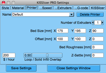 - Extruder RPM min - раритет доставшийся от машинок с приводом экструдера от постоянного двигателя, он тупо не умеет вращаться медленее чем некая скорость. Для нас, использующих в экструдерах шаговики тут может стоять и ноль, но я не уверен, поэтому у меня стоит 0.1