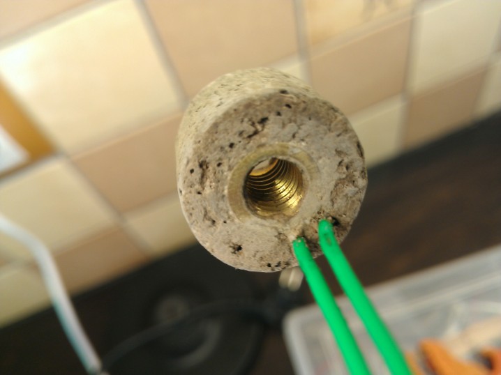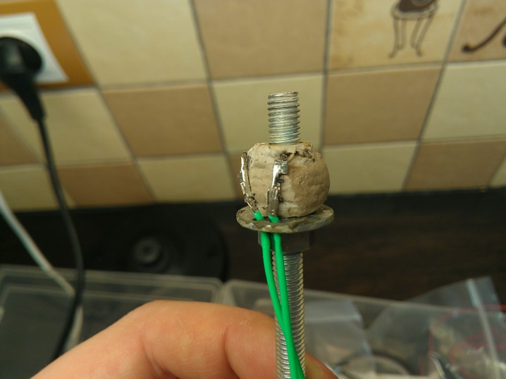 Потом, формируем вывод нихромовой проволоки, немного разматав и при необходимости разломав керамику.