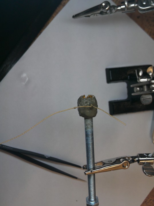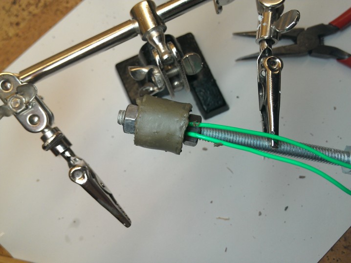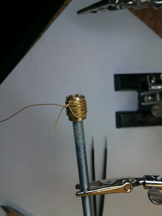 Начнем, намотка нихромовой проволоки на нагревательный штуцер. Тут все просто, витки укладываем в резьбу, стараясь не повредить тряпичную оплетку проволоки.