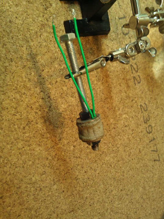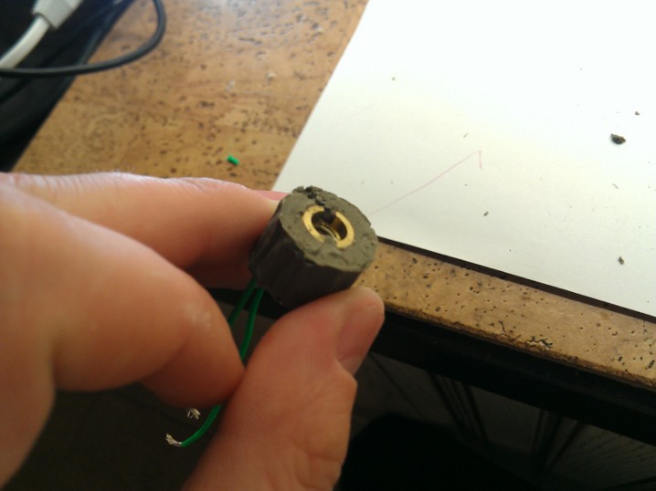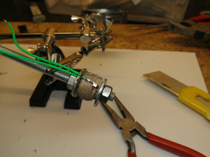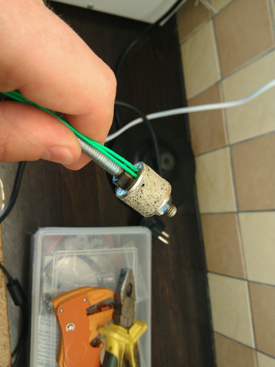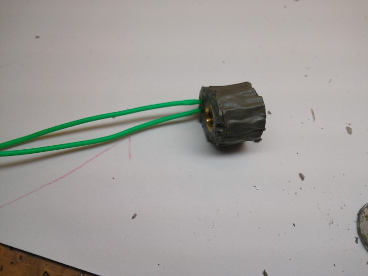 Далее собираем конструкцию с шайбой. В шайбе заранее проделал две канавки для проводов.