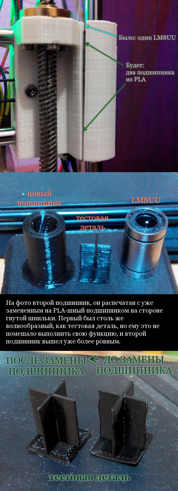 Geratewart писал(а):Все такие способы не дают гайке полностью свободы по x и y. Гайка либо через силу трения (как здесь) либо через упругость (как тут) будет давить на каретку, и она будет перемещаться пока есть зазор в подшипнике. Поэтому нужно и то и другое. Начну с каретки, а потом займусь подшипниками. Тогда отпишусь с пруфом, что поможет.