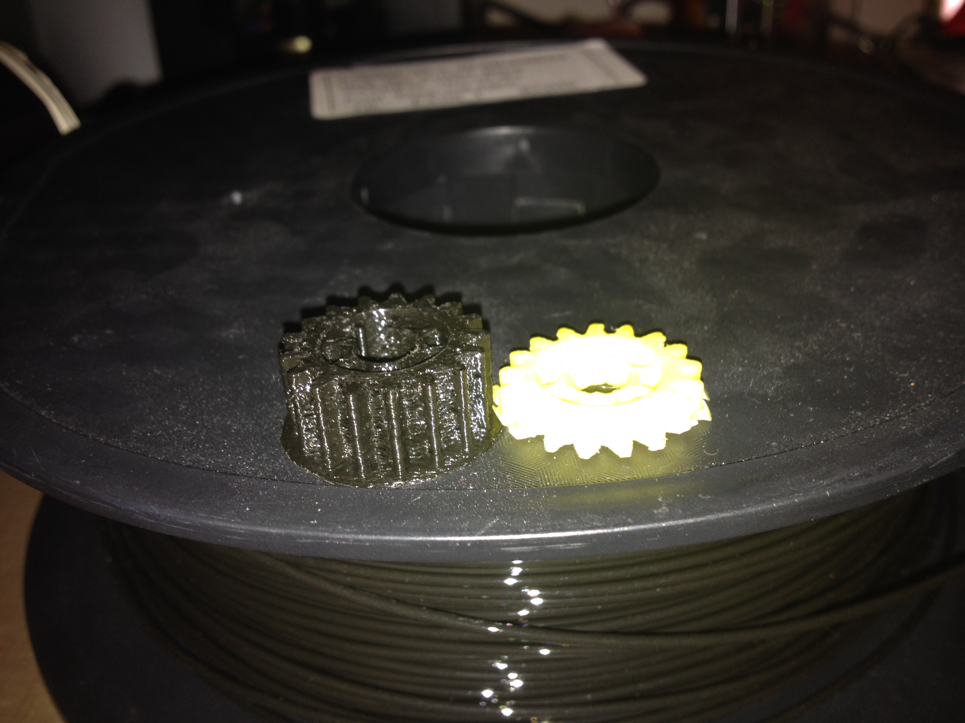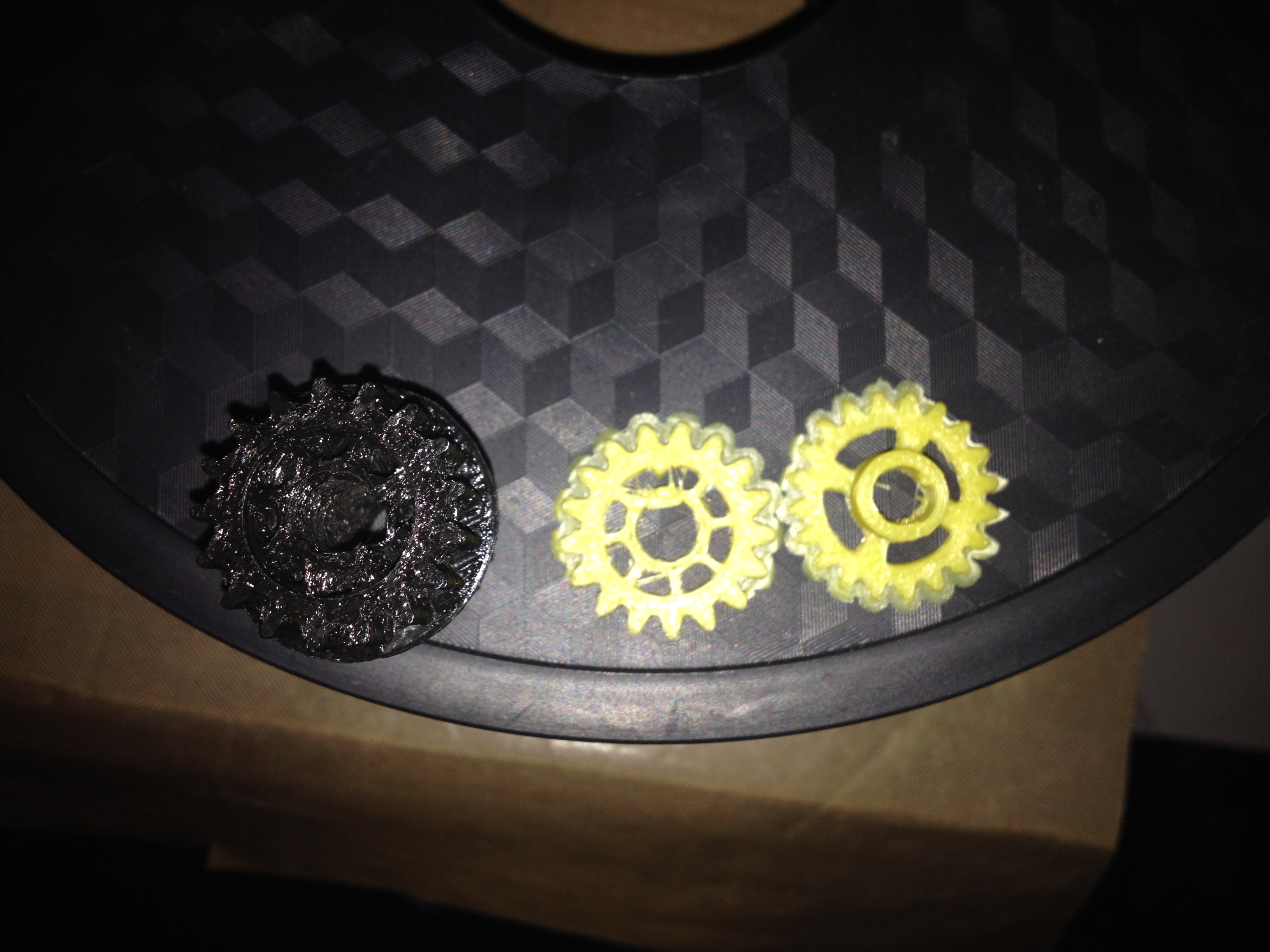 И самое главное, почему, например при печати шестерёнки, вершины зуба печатается чисто, а между ними такой срач, что... На фото для сравнения АБС справа. Там зубчик к зубчику, а ПЛА... даже слов нет.. я уж не говорю про прочность тонкой части, где всего толщина в один диаметр сопла..