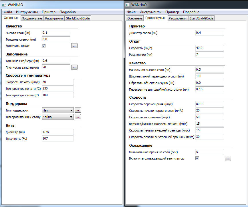 Делал в Cura, сложно сказать какие тогда параметры были, месяц уж прошел.