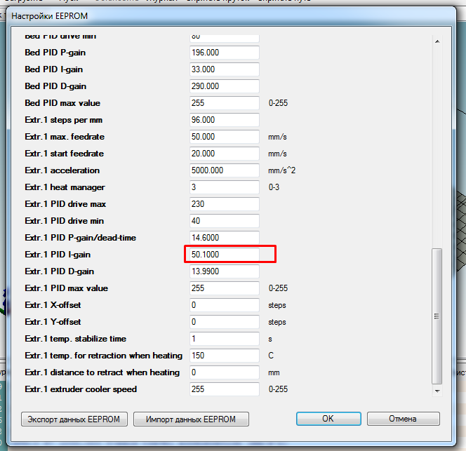 Myp писал(а):я уже сказал, если хотенд недогревает до заданного, значит надо увеличить цифру I, пробовать увеличивать надо по немного, на десятые доли, пробуй сделать +0.2, потом ещё немного.