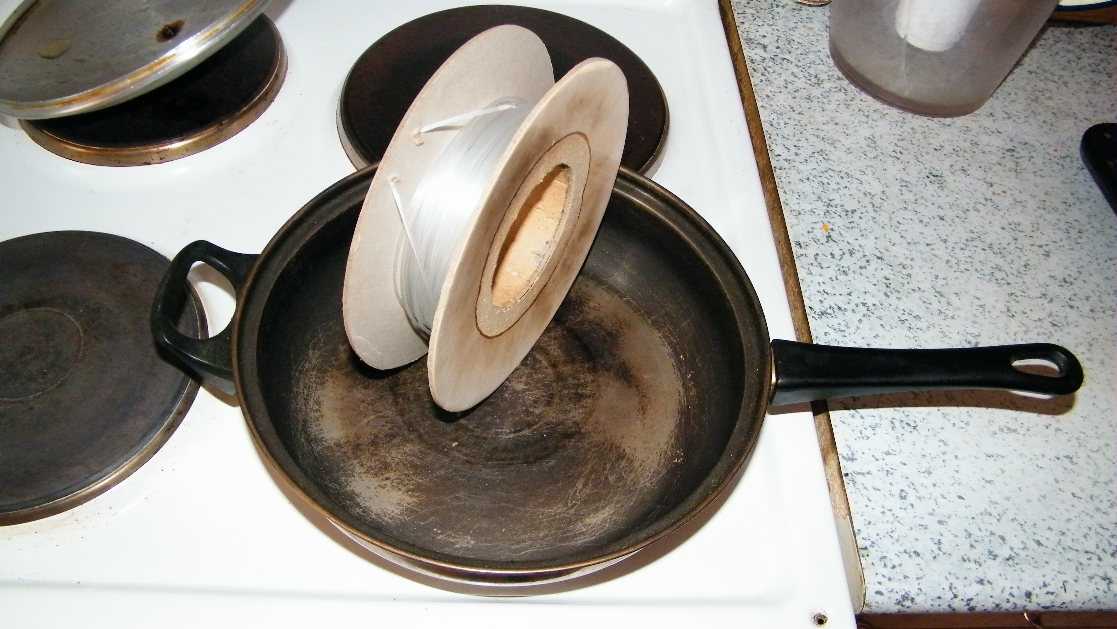 Взял сковородку туда катушку с леской и на медленном огне на плите сушил 3 часа с температурой примерно 80 градусов.