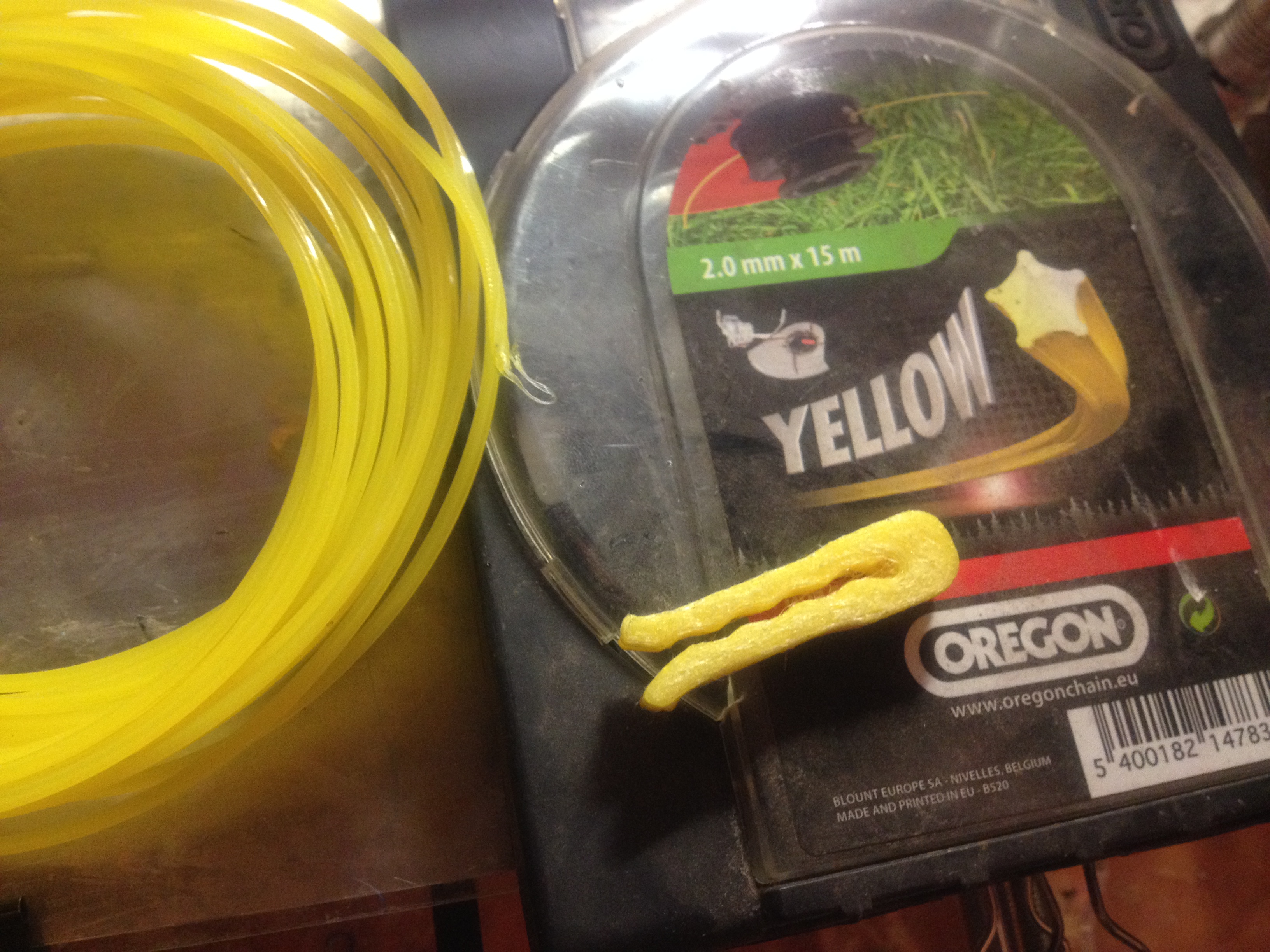 Попробовал я сегодня триммерной леской. Не знаю из чего она, не написано, но в общем то лезет )) Не почитал я про неё, и принеся из сарая, сразу воткнул в принтер. Услышал много треска (как выяснилось из за сырости) и в общем то почти нет межслойной адгезии, особенно вначале, ближе к концу печати слои пошли уже более менее.