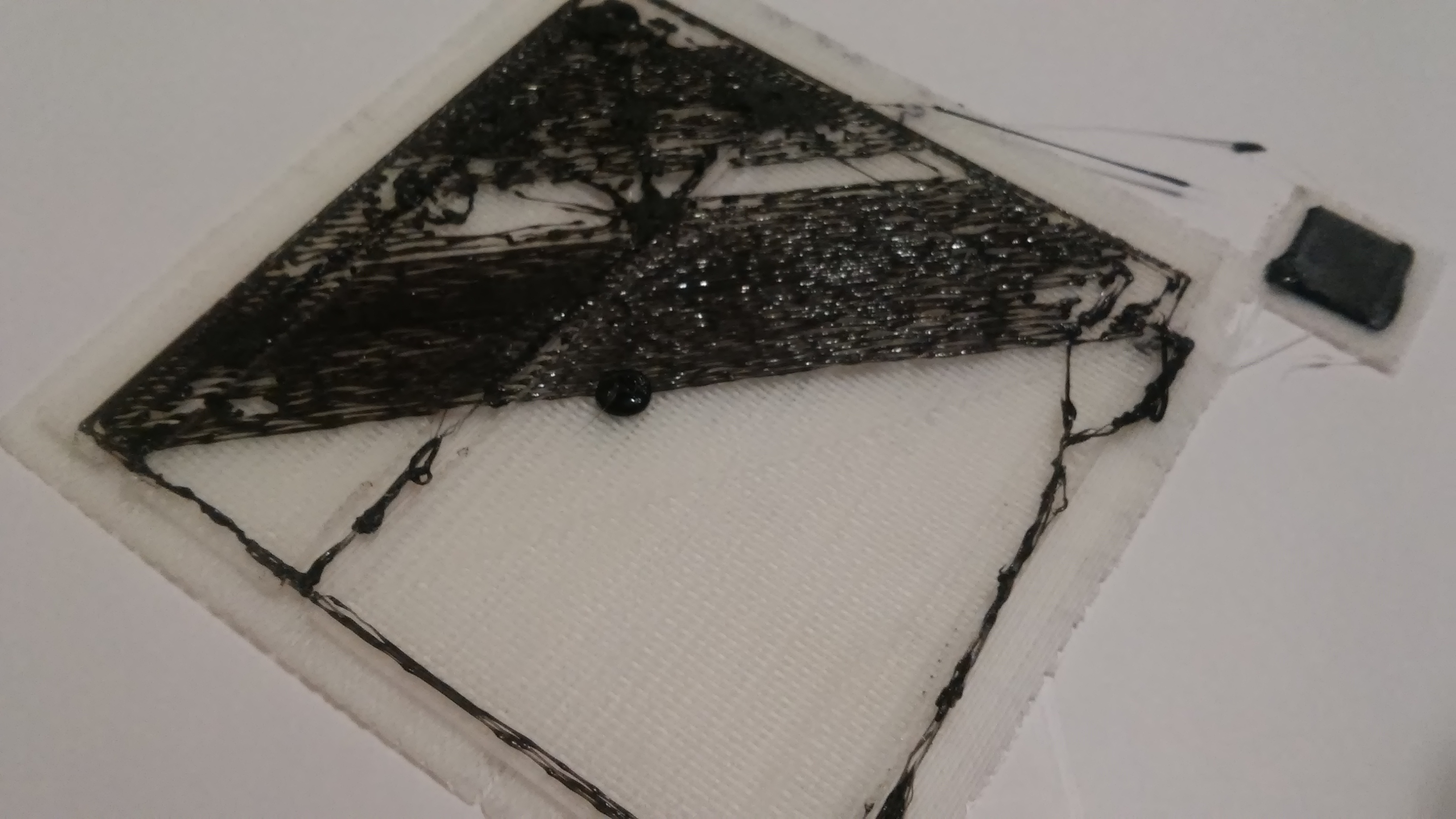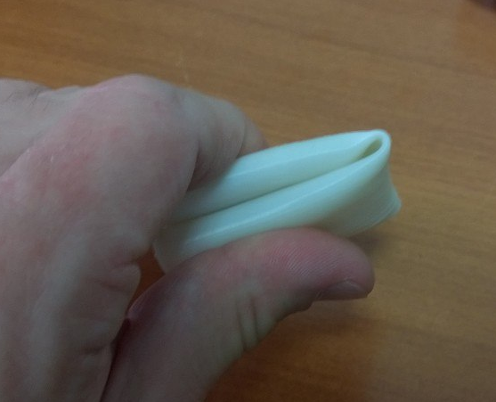 Деталька получилась уж оочень гибкой, но не ломается (полностью внаглую не стал ломать). Диаметр 2мм, но, похоже из-за её звезданутой формы она не застопорилась в хотэнде а спокойно давилась. Печатал на 235град и стол 60. Не знаю как надо правильно, просто из-за треска и поддымливания снизил с 250град после печати АБС. Положил сейчас на стол, включил нагрев. Хочу попробовать просушить и еще попробовать.