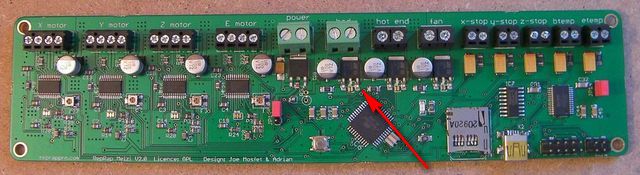 насколько я понял, на первой плате(мельци 1 - нижний рисунок), полевик расположен на самом термостоле,а от процессора atmega1284P(контакт 31) идёт только сигнал через резистор, +24в приходит так же на термостол непосредственно.