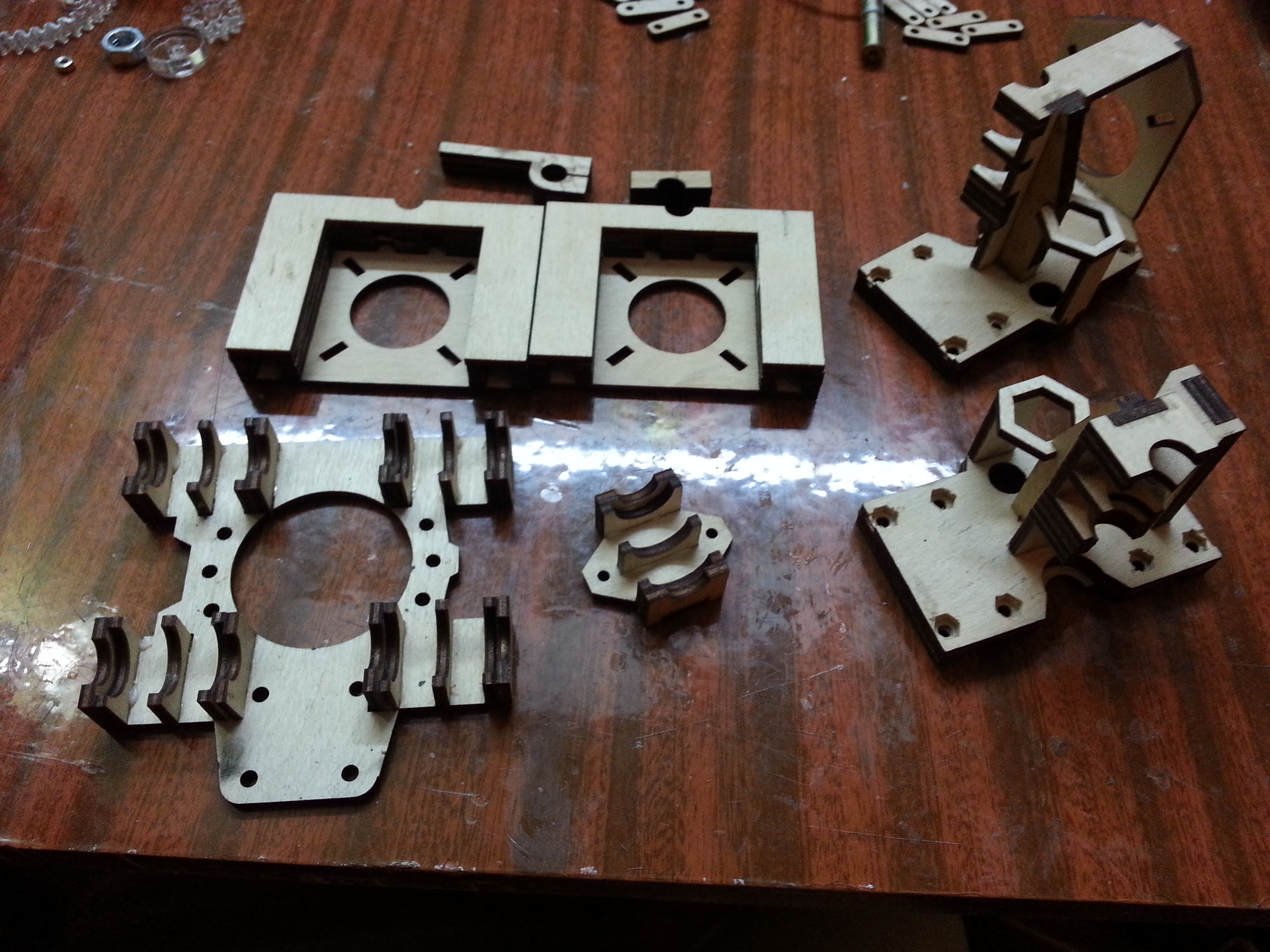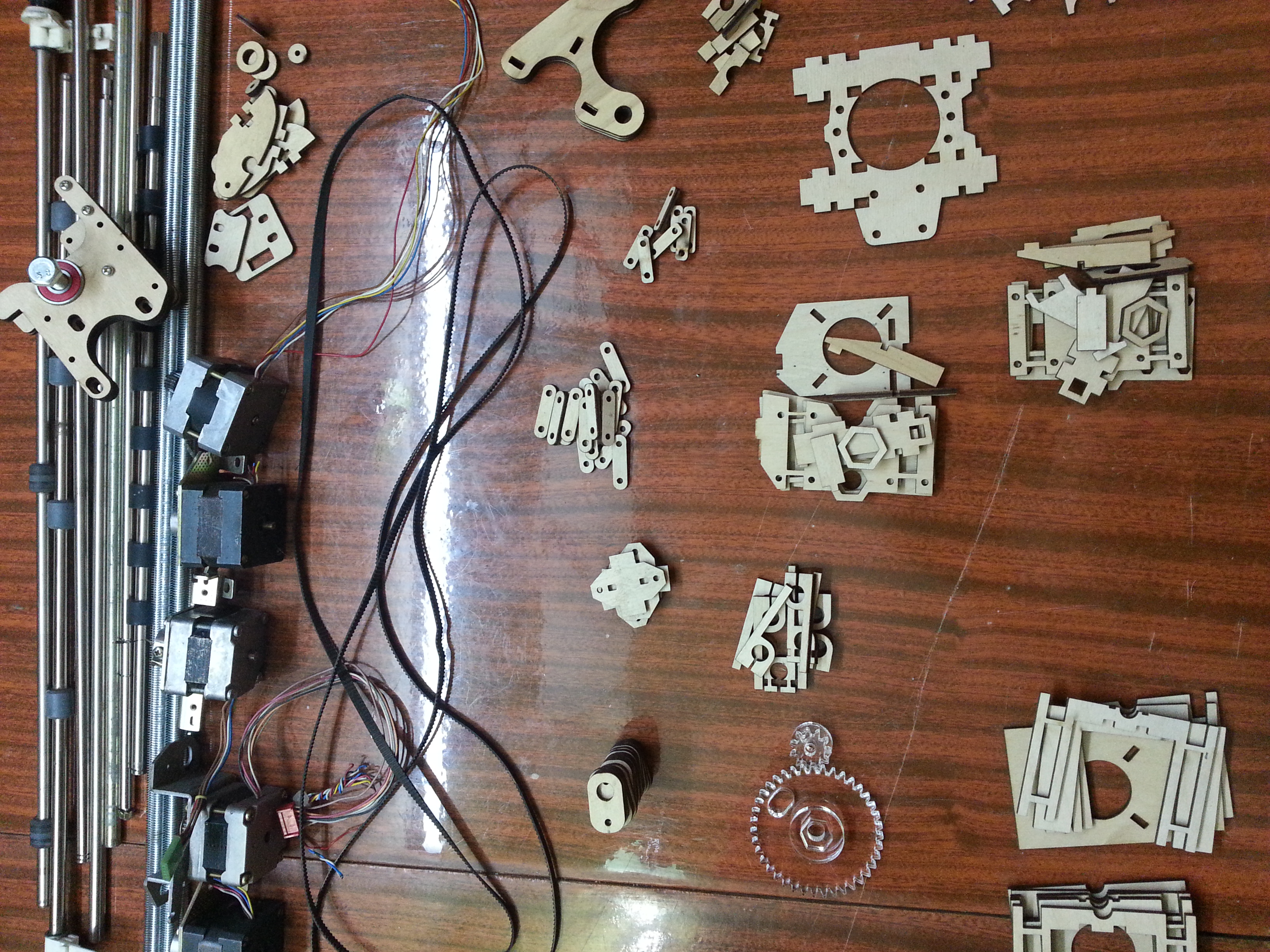 Все чего мне не хватало из механики, это детали из пластика. Покупать то, что можно сделать самому, не по нашему. Я решил их изготовить из фанеры, нарезав лазером в знакомой фирме, которая делает наружнюю рекламу. Плюсом этого метода является то, что без шума и пыли мы получаем очень точные и достаточно прочные детали. Перечертил все в солидворксе под фанеру 3 и 6 мм. Но в наличии не оказалось 6мм фанеры, пришлось два раза резать из 3 мм и клеить чуть больше. Шестерни экструдера резал из акрила 5мм тем же лазером.