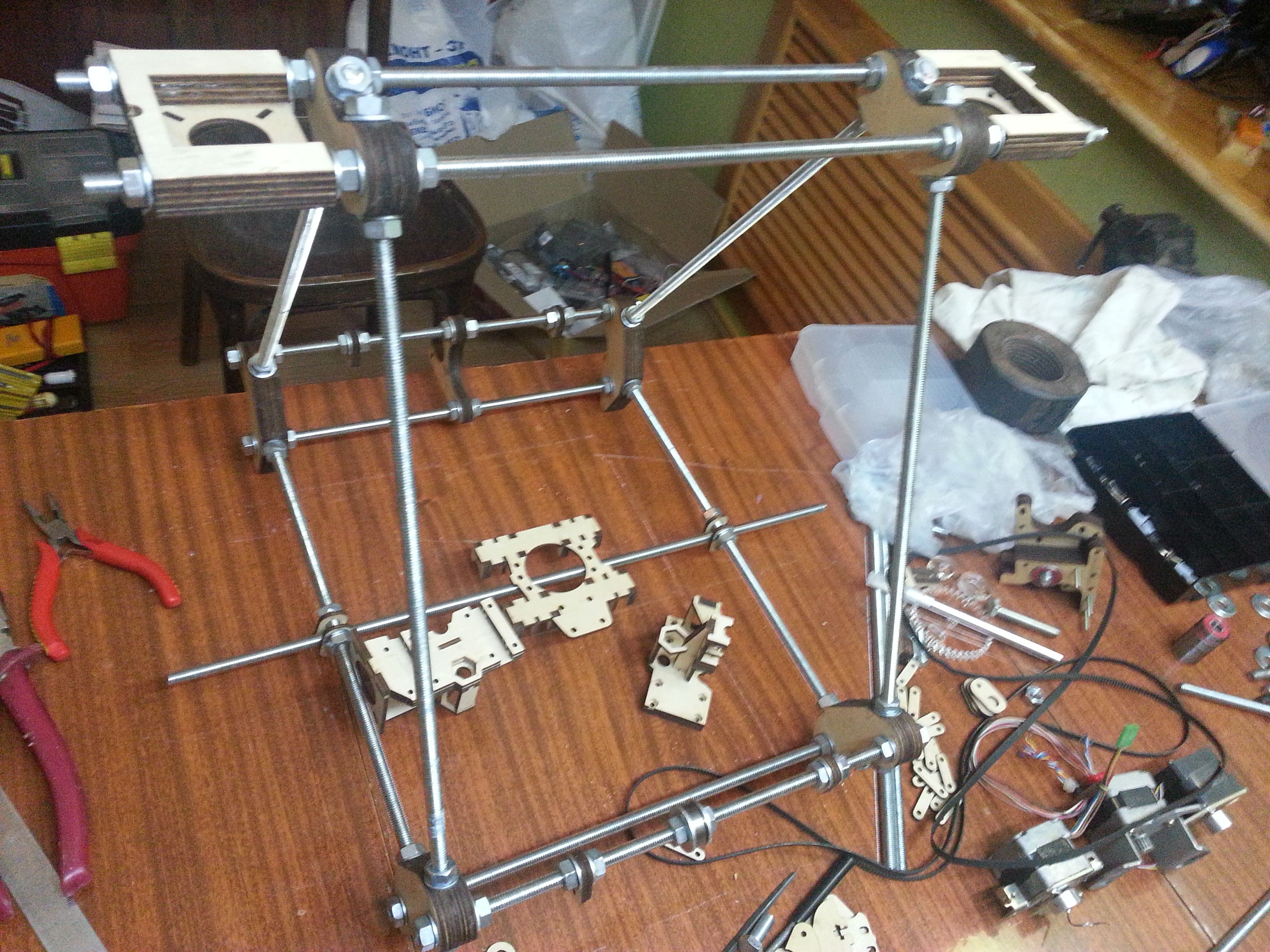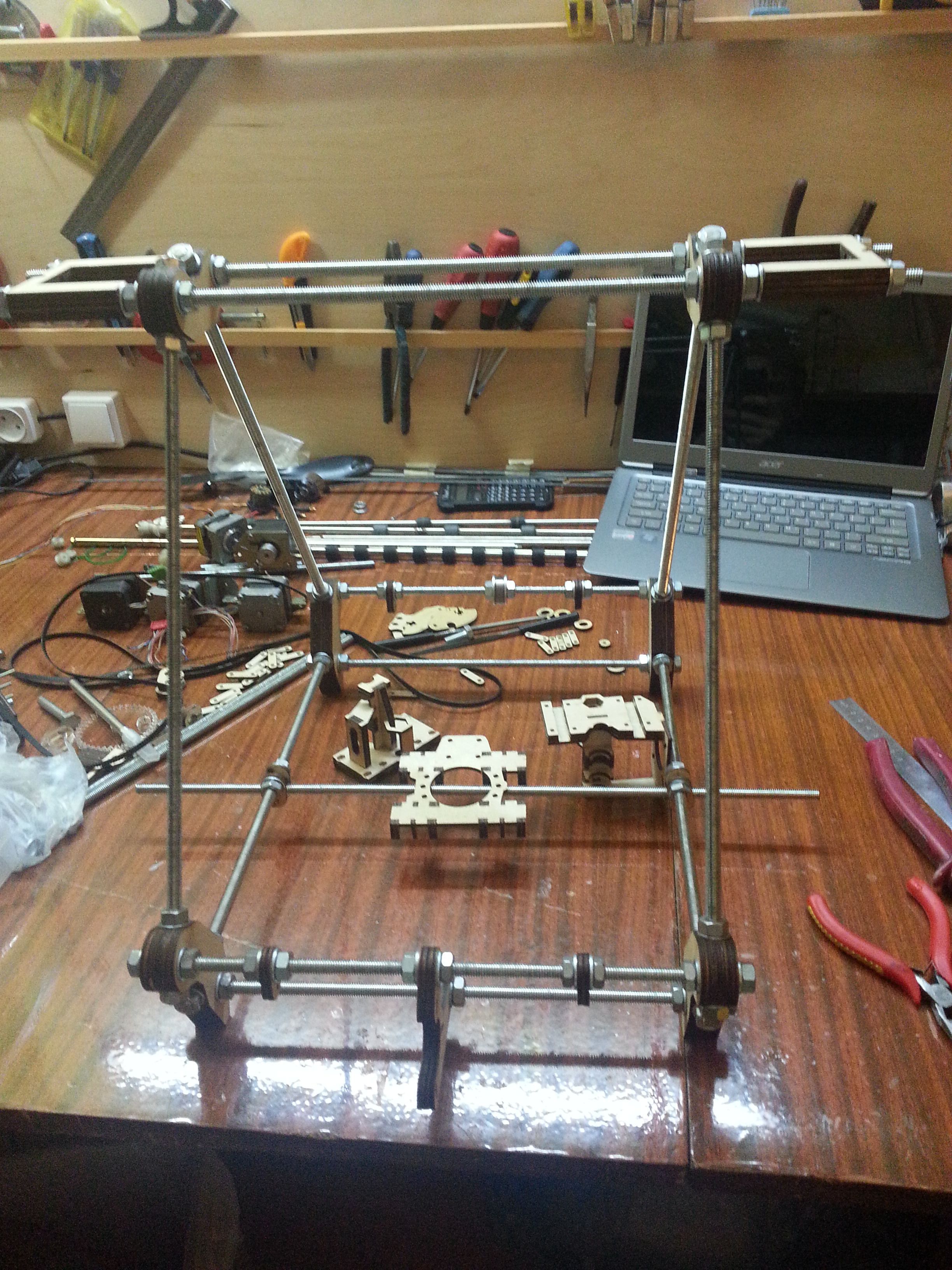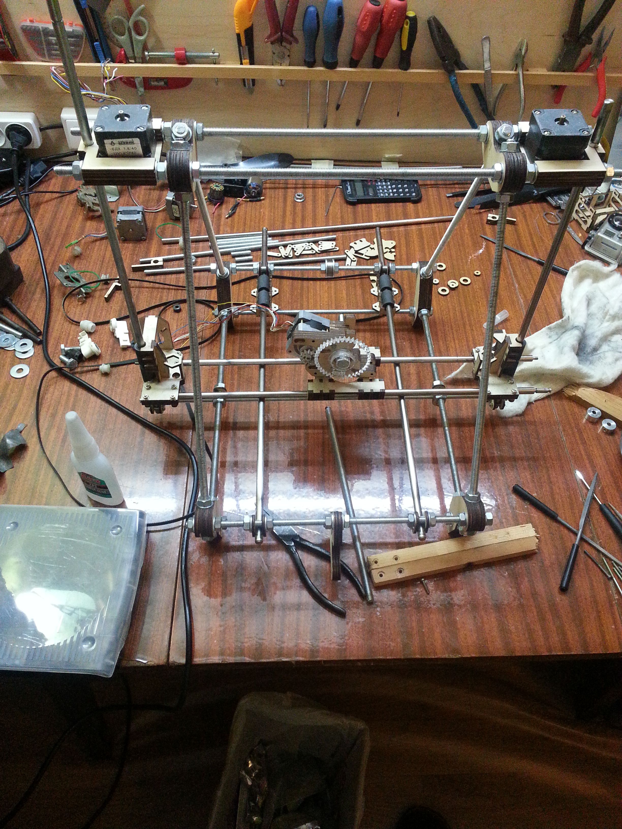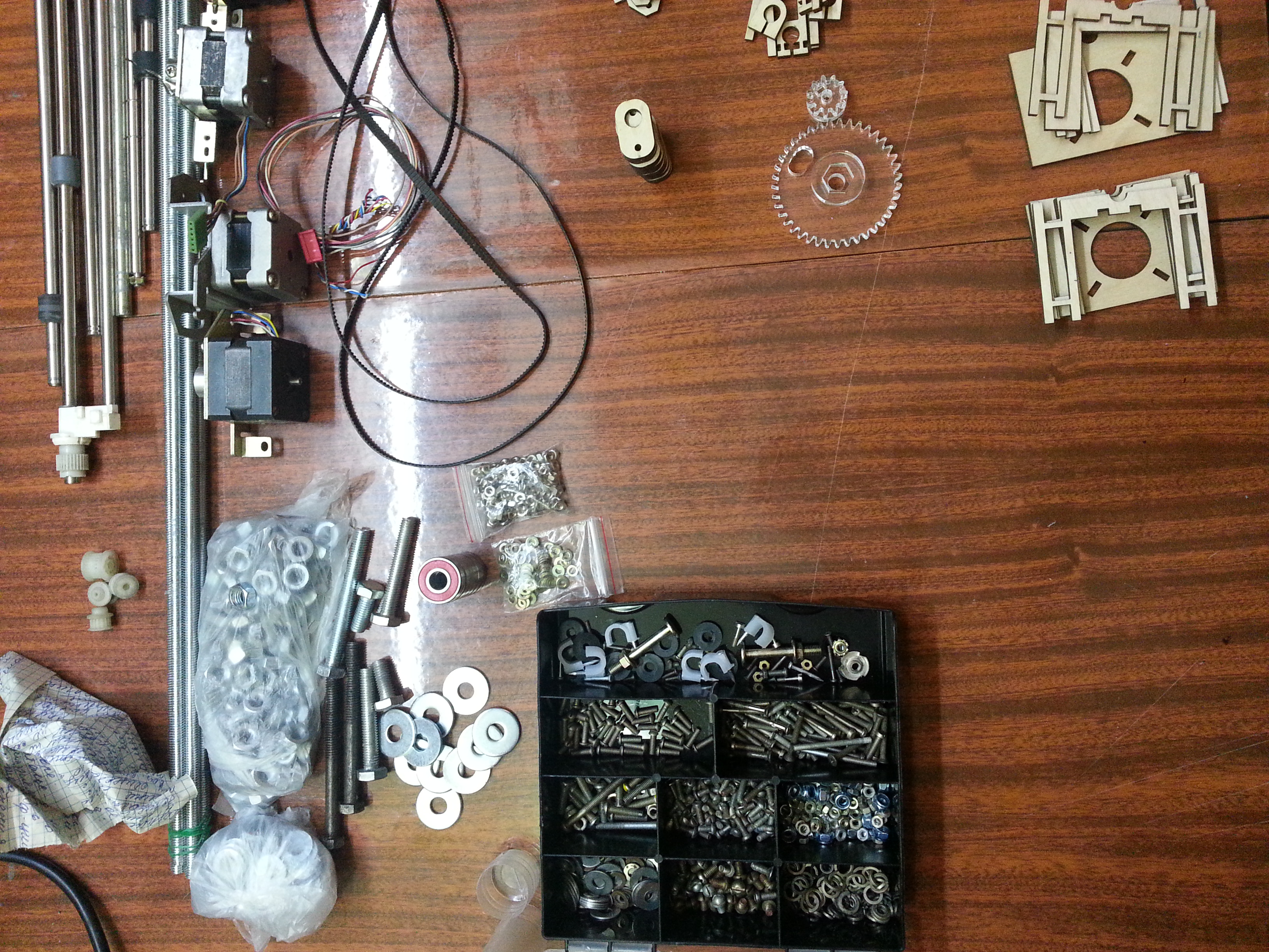 И вот, на прошлой неделе, опять наткнулся в сети на это чудо. Руки начали чесаться. Решил сделать Prusa Mendel для начала. Поехал на барахолку, купил шпильки, валы от старых принтеров, подшипники, гайки итд., и, даже, двигатели nema17 от 5.25" дисководов.