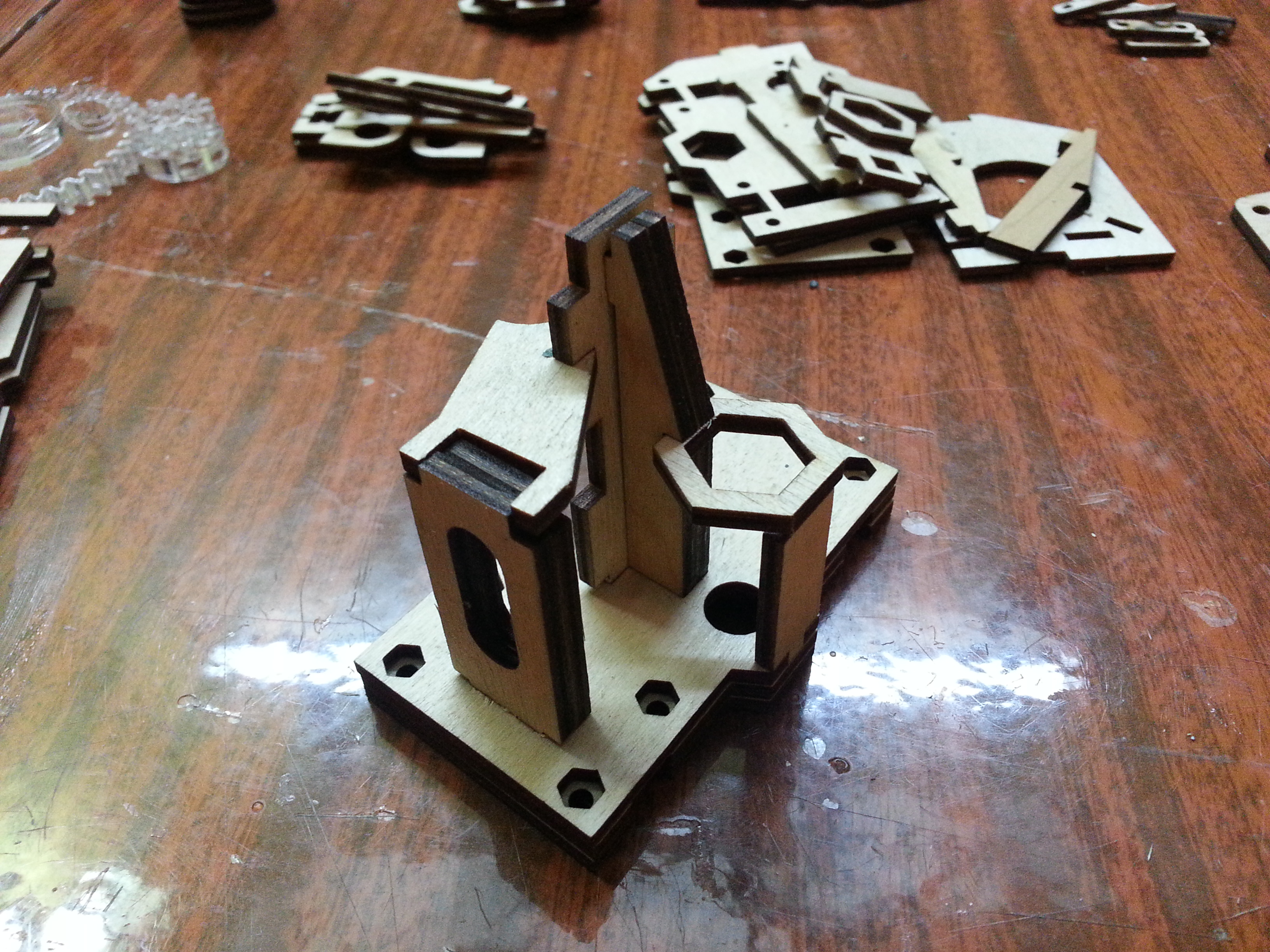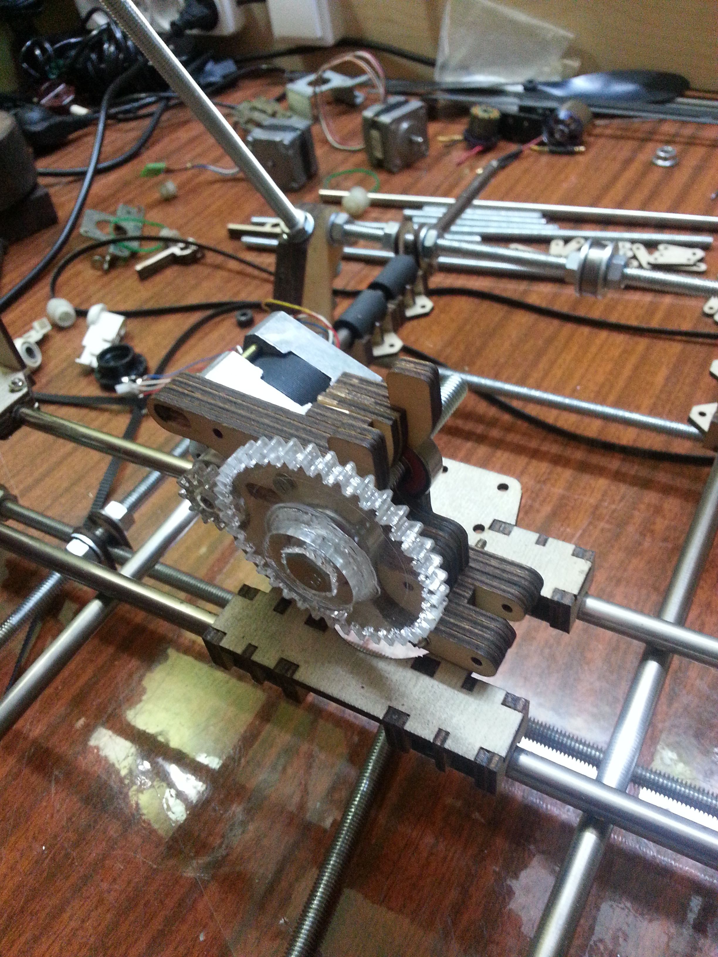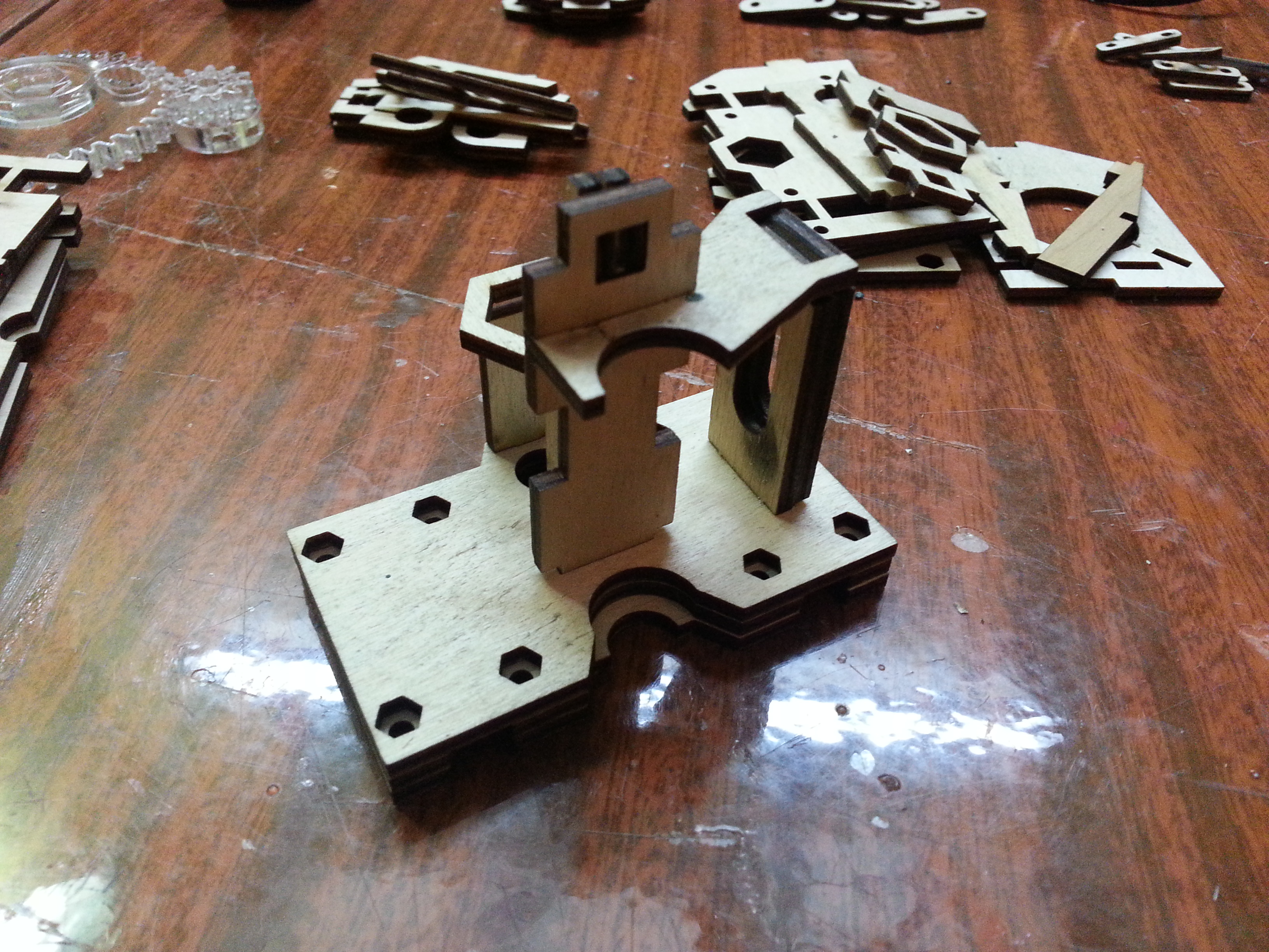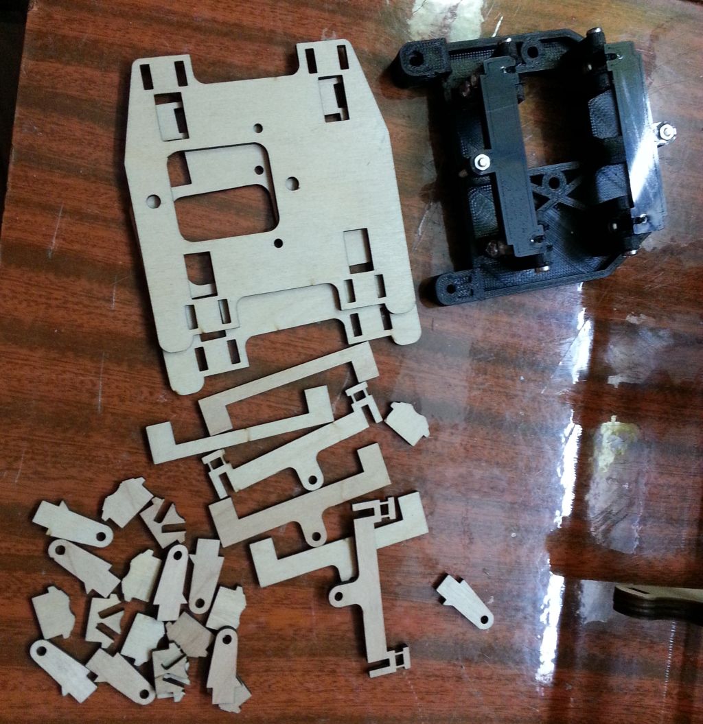 Все чего мне не хватало из механики, это детали из пластика. Покупать то, что можно сделать самому, не по нашему. Я решил их изготовить из фанеры, нарезав лазером в знакомой фирме, которая делает наружнюю рекламу. Плюсом этого метода является то, что без шума и пыли мы получаем очень точные и достаточно прочные детали. Перечертил все в солидворксе под фанеру 3 и 6 мм. Но в наличии не оказалось 6мм фанеры, пришлось два раза резать из 3 мм и клеить чуть больше. Шестерни экструдера резал из акрила 5мм тем же лазером.