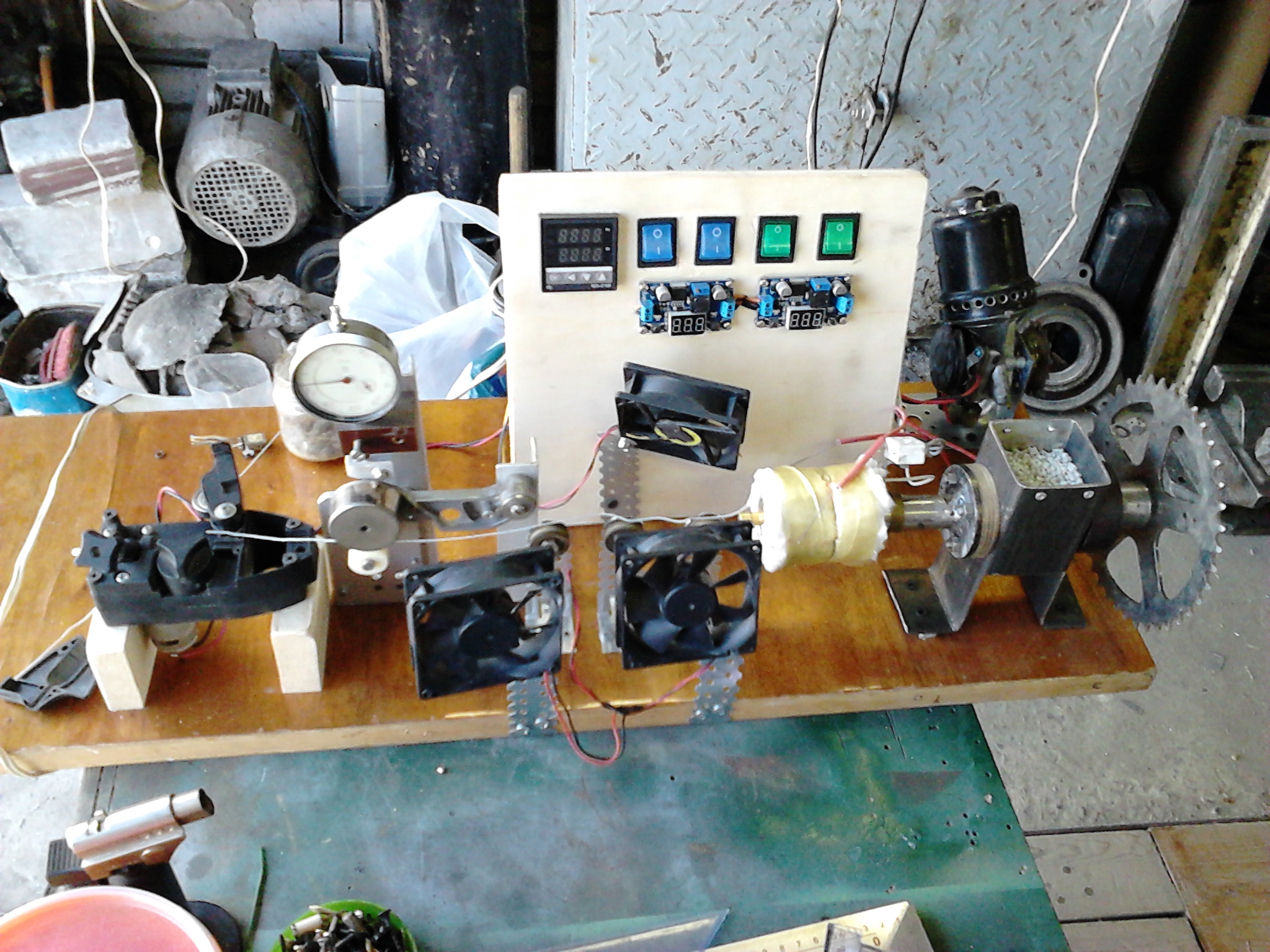 Ставил тоже диод 5-10ампер 500-1000в, что найдете. В гараже валялся 5а 500в, его и поставил, а там смотрите на мощность вашего нагревателя- делите ее на 220 и получите значение тока. Мощность диода лучше с запасом, не так сильно греется. Нагреватель делал самодельный, так как китаец умер при включении. Брал спираль 600 ватт и мотал через слюдяную изоленту, на алюминиевую болванку. Получилось два слоя. Сверху покрыл каким-то материалом, хз как называется, на вид вата только не горит, используется в сталелитейном производстве для теплоизоляции. При первом включении много дыма потом ничего. Мотал одновременно с леской для разделения витков. Спираль перед намоткой несколько минут прогрел для образования оксидной не проводящей пленки. Леску диаметром 0,3-0,35 после намотки слоя удалил. То что получилось на фото после первого включения разорил-не хватает мощности двигателя экструдера( не делайте так-потеря времени и нервов), заменил на связку мотор редуктор+двигатель 0,37квт + частотник 400ватт, как следствие стабильность оборотов и диаметра. Сейчас переделываю протяжку и жду нужный пластик. Интересно посмотреть как происходит запуск установки у собравших ее, включение-выход нити-заправка в протяжку-заправка в намотчик-разгон-синхронизация, а так же нюансы настройки. Может кто поделится информацией, выложит видео?