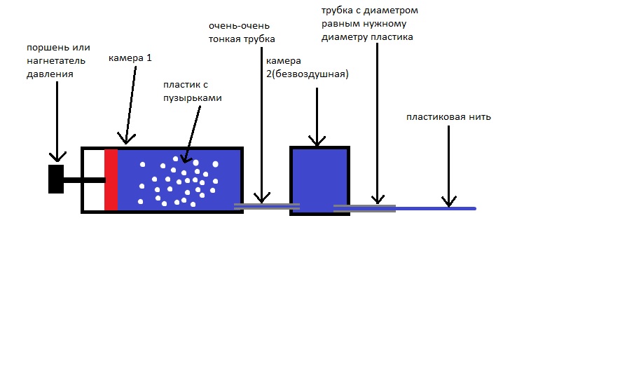 . суть такова: есть 2 камеры, в 1 находится расплавленный пластик с пузырьками. от 1 камеры во 2 ведет очень тонкая трубка (возможно от шприца). ВАЖНО, чтобы она располагалась в самом низу 1 камеры (там пузырьков меньше всего), затем по этой трубке, давлением выдавливается пластмасс во 2 камеру(в 1 камере, сверху, стоит сделать воздухоотводный клапан). Из-за малых размеров трубки, пузырьки будут просто отсекаться из колбаски пластика. Затем, пластик, уже без пузырьков попадает во 2 камеру(второй конец узкой трубки неправильно изображен, он должен быть в самом верху 2 камеры, чтобы воздух, который всё-же попал в трубку, переходил вверх 2 камеры, до которого пластик так и не достанет (выпускная трубка то внизу)), носик которой, так-же располагается в самом низу. во 2 камере так-же стоит сделать сверху воздухоотводный клапан(чтобы, когда нагнетаем новый пластик во 2 камеру, из выпускной трубки не пошел воздух). Когда 2 камера достаточно наполнилась, и продолжает наполняться, из выпускной трубки пойдёт струйка пластика, а т.к. 2 камера постоянно наполняется, струйка будет непрерывной. Вот такая вот херомантия)))))