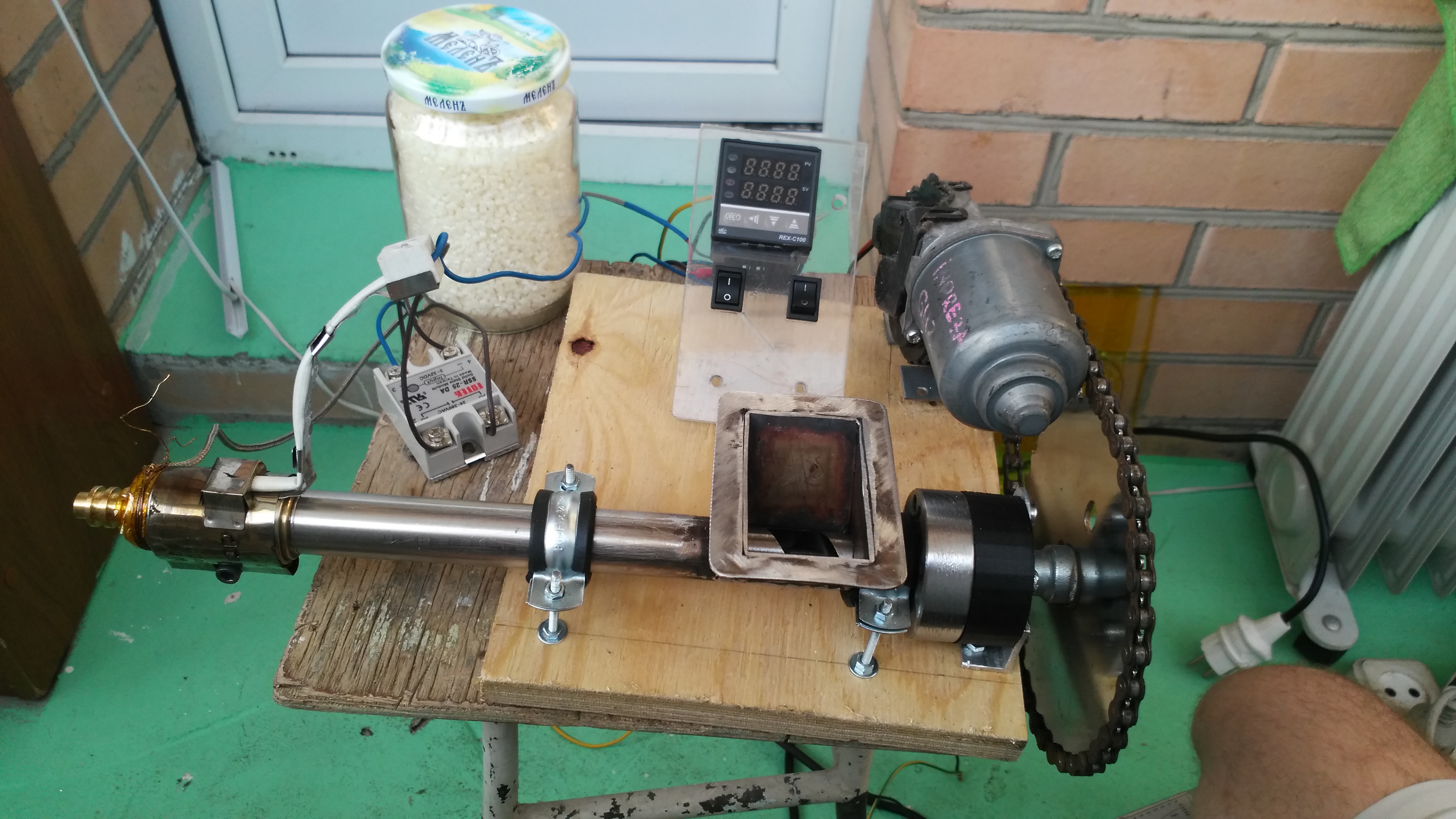 Добавлено спустя 1 час 6 минут 51 секунду:Мне наконец то трактористы сделали нормальную давилку, правда обойму для подшипников еще надо сделать из металла (я распечатал на принтере) и маленькую звездочку сломали когда варили (очень тонкая была). Пока не нащел малькую звездочку решил попробовать как все с движком от дворников (мои разочарования мягко говоря подтвердились....). Пол дня протрахался не мог цепь настроить постоянно слетала, пришлось делать под углом относительно давилки, когда включил тоже беда пластик никак не хотел лезть.... спилил пол сопла (было 25мм - сделал 10мм) все равно не лез, температуру поднял до 240 градусов, в итоге пошевелил термопару и началось - пластик стал выливаться тоненькой струйкой, падая он еще больще растягивался под собственным весом. В итоге при дырке в 1,5 мм нить получалась 1-1.3 мм. Понизил температуру до 220 стало вроде 1.5- 1.8 но двиг начал раскаляться мокрая тряпка на нем зашипела. Теперь стало все понятно на электроусилителе я ставил температуру 190 градусов и получалась красивая глянцевая нить причем она застывала в 3х сантиметрах от сопла, тут же нить получается бугристая и кое где встречаются пузыри (видать пластик надо просушить) а кое где странные угловатые дырки в нити (видать края недоплавленных гранул) и нить еще пластичная даже когда лежит на полу. Вопрос ко всем кто обошел эти грабли: какая должна быть температура и дырка в сопле? И еще на сопле с выходящим пластиком образовывается какаето вата и когда ее становиться много (примерно каждые 5 минут) нить цепляется за нее и получается узел, что это за хреновина??? ну охлаждение нити на выходе я сделаю, но чтото подсказывает что сопло надо растачивать....
