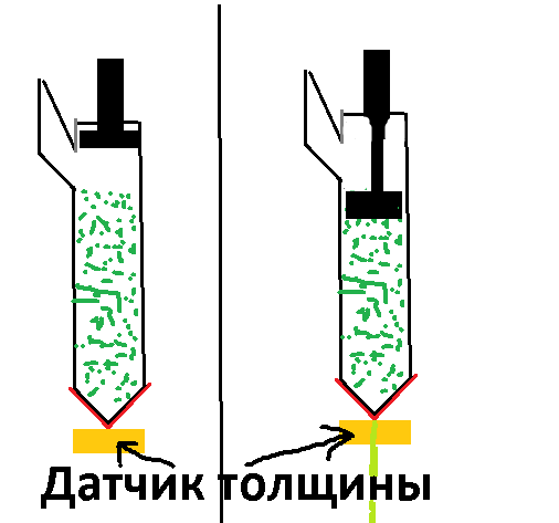 Принцип работы засыпаем, прогоняем пока не полезет пластик. При выдавливании на выходе стоит датчик толщины, который на лету увеличивает или уменьшает скорость давления толкателем.Килограмм гранул насыпали и ждем, так же толкатель можно с отверстиями для выходя воздуха сделать, чтобы воздух выходил.