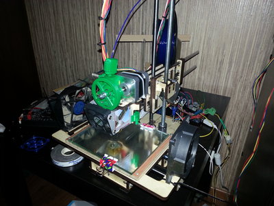 Не всё так гладко как хотелось бы, но это дело времени. Основная проблема кривой печати это слабенький блок питания, при включении нагрева экструдера напряжение проседает с 12В до 8В, когда уже нагреется начинает пульсировать и во время печати начинаются пропуски шагов и модель уплывает