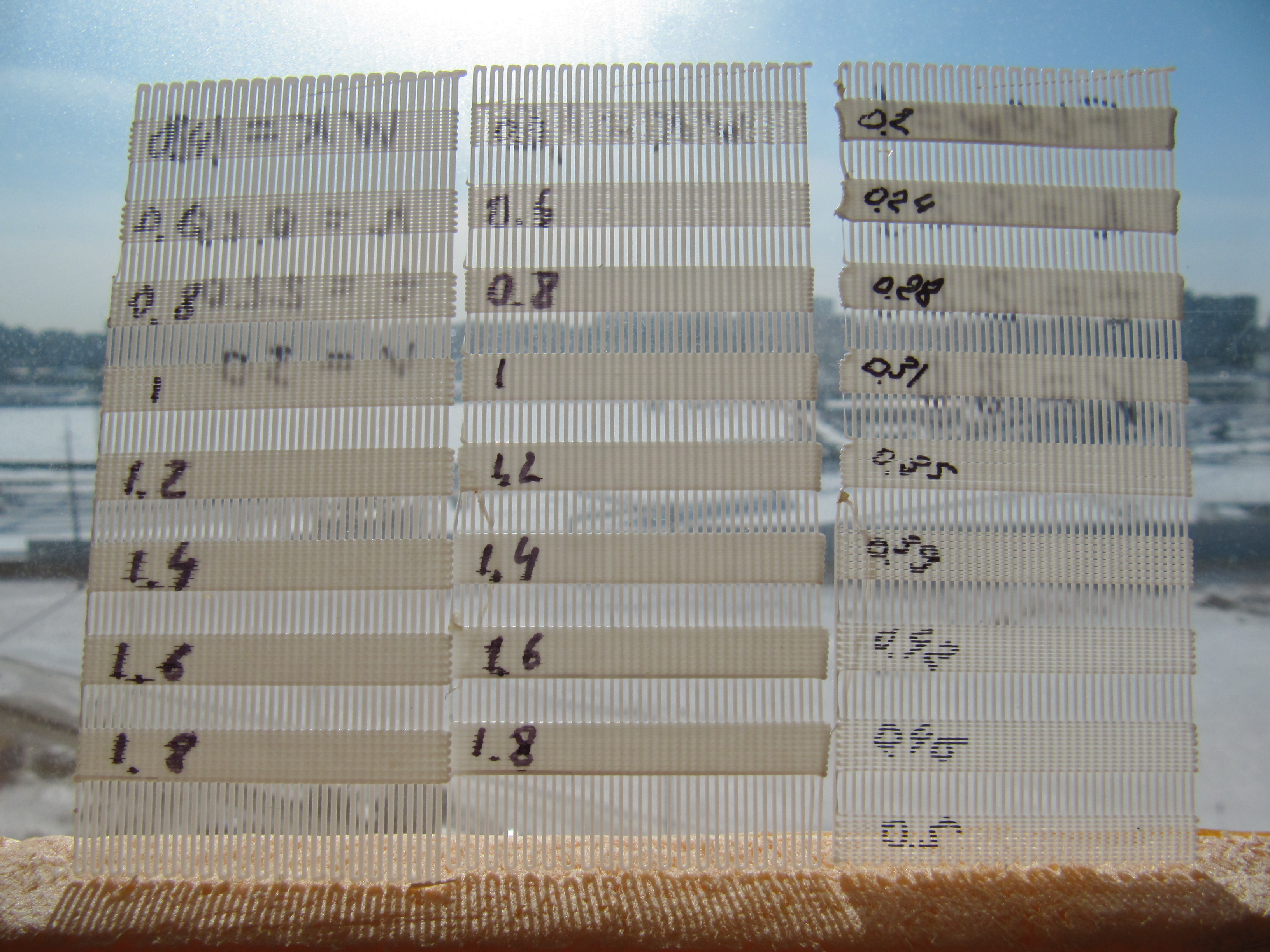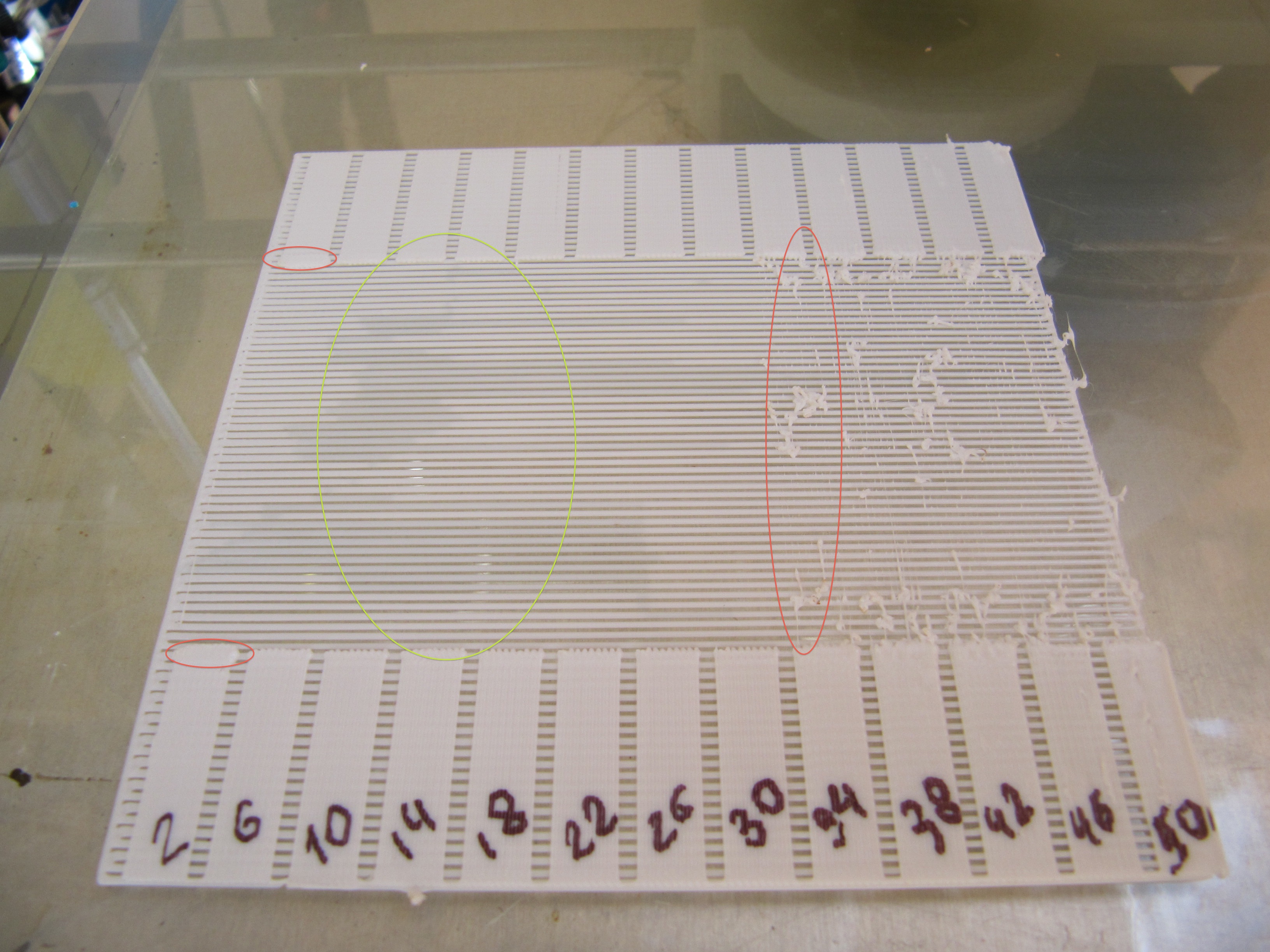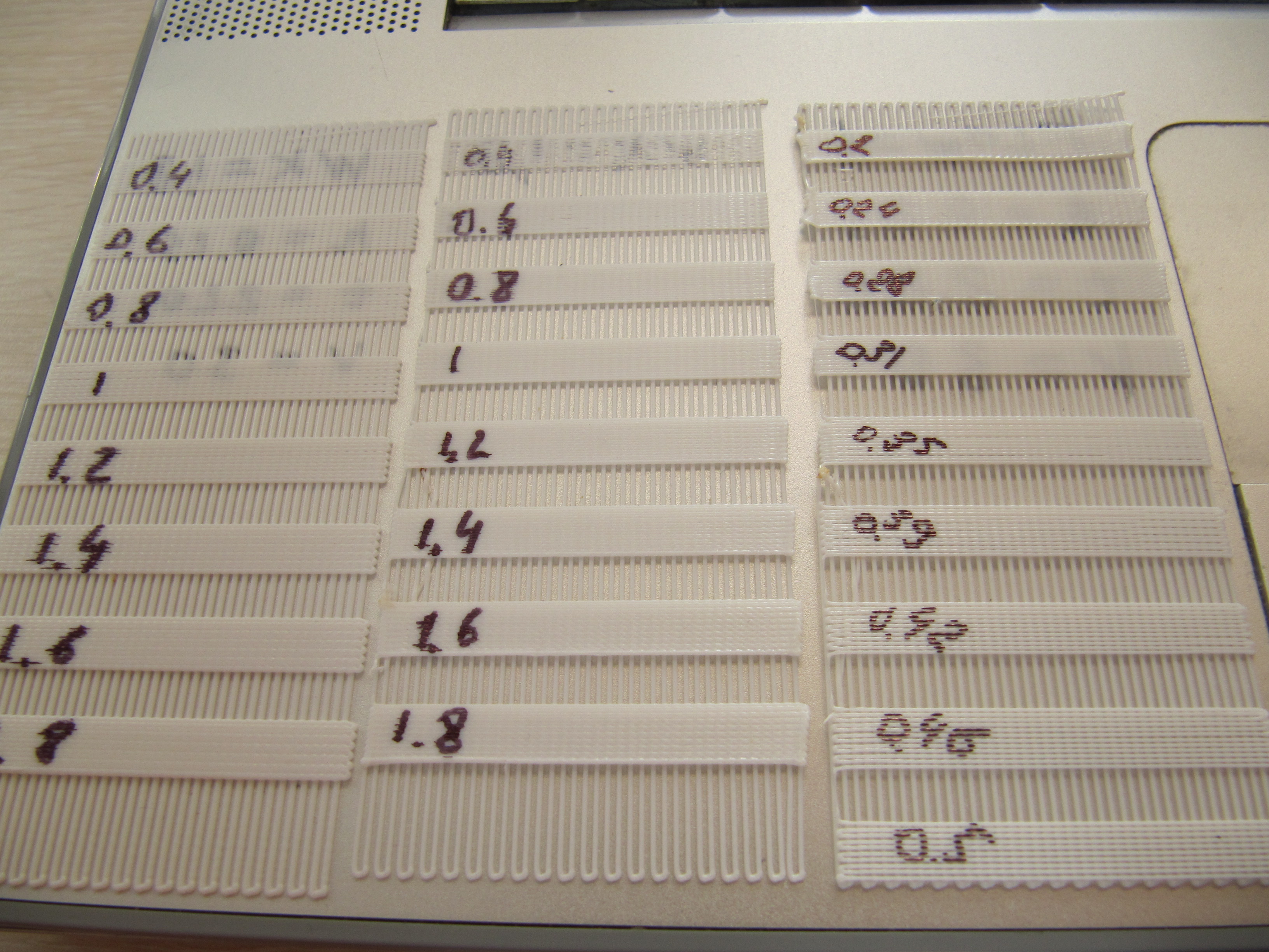 2 печатать набор полос не меняя параметров но меняя расстояния между полосами. Как только они сольются мы получим реальную ширину экструзии при заданной теоретической. Далее уже меняем подачу так чтоб эти величины совпали.