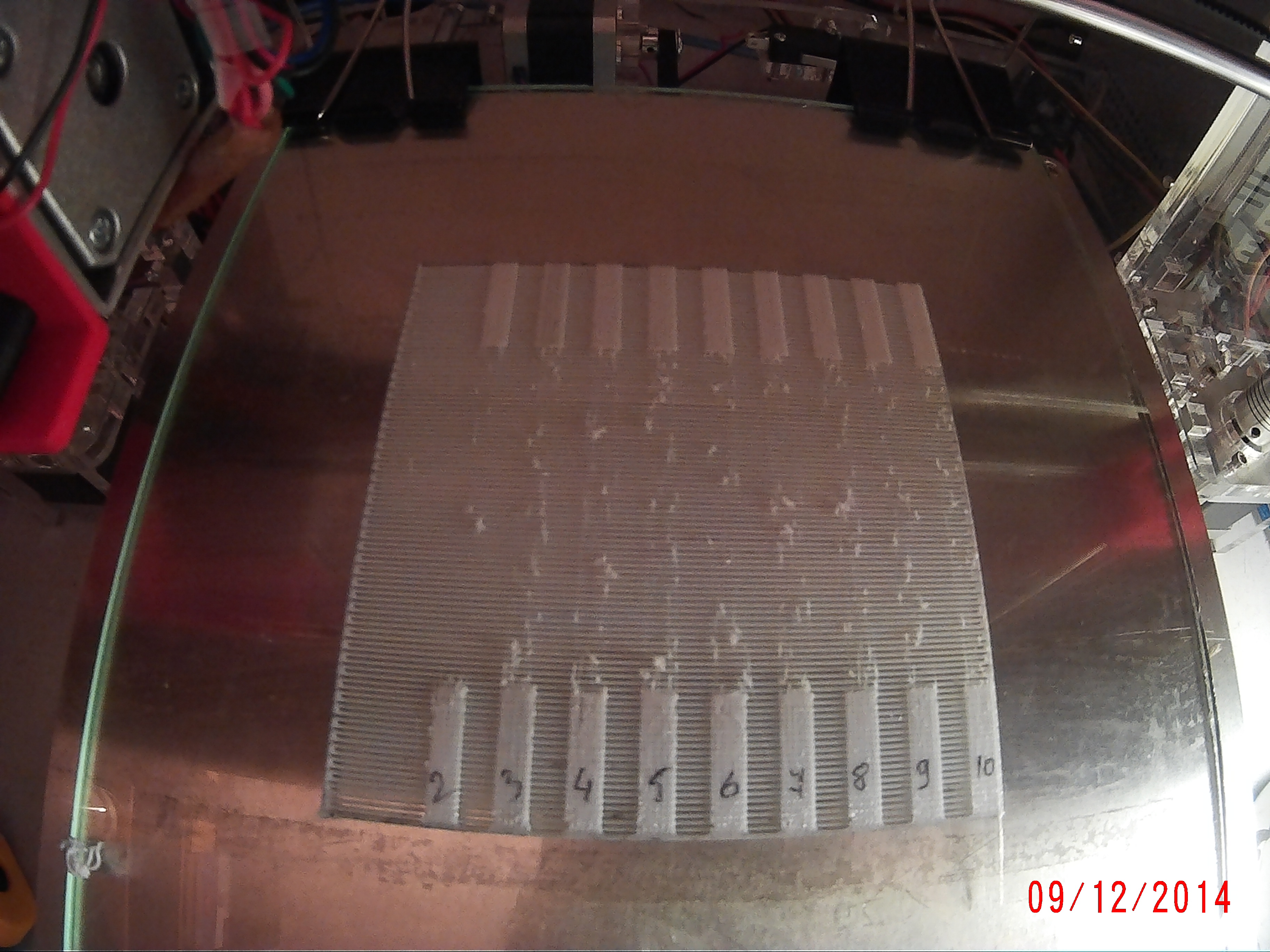 Приехал мой принтер RigidBot. В 3D печати я тока полный ноль (((. Печатать что-то осмысленное не решился, точнее решился но получилось полное Г. Решил пройтись по тестам, и сразу много вопросов возникло. Попробовал напечатать подложку (рафт). Получилось с 5-го раза, постоянно отрывался один и тот же угол и линии были неравномерные, то нормальные, то узкие - не хватало пластика или скорости экструзии. Хотя до этого распечатывал температурный тест и с подложкой все было нормально. Стол подкручивал несколько раз, но проблему не решило. Потом вспомнил, что температурный тест я проходил на скорости 30 мм/с, а рафтовый - 50 мм/с. Снизил скорость и все стало ОК. Я прикладываю фото рафтового конечного результата. Мне не нравятся расстояния между полосками, иногда они равномерны,а иногда больше чем надо. Еще по краям(наплывы) и самая первая линии более толще, чем внутри периметра. Подскажите,