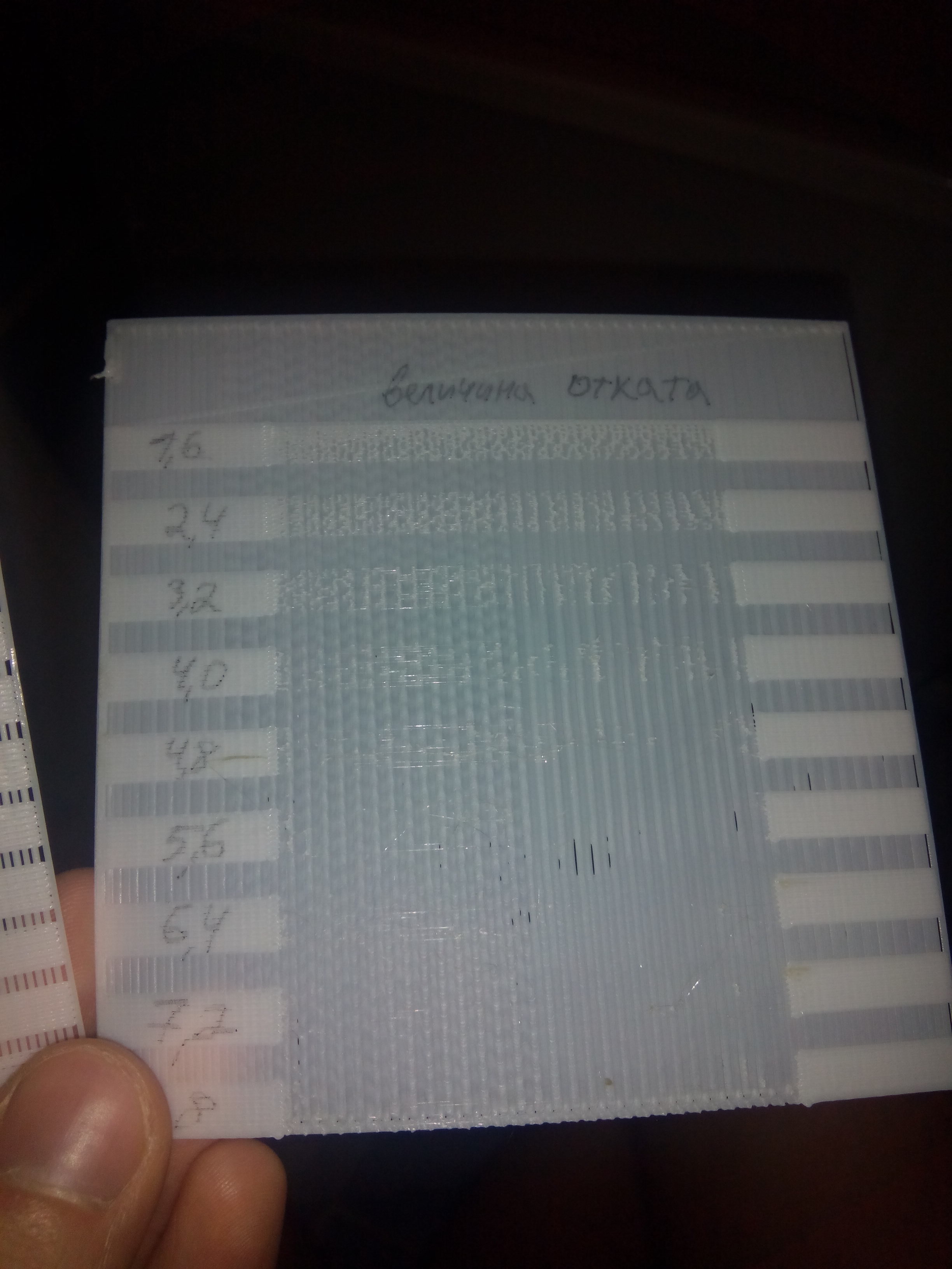 Ставлю тест скорости отката, величину отката ставлю 5.6мм, остальные настройки не меняю. Запускаются тест и... Принтер нормально печатает рафт, делее печатает первую линию, останавливается и вместо того чтобы сделать ретракт - он наоборот делает подачу пластика. Далее едет на другую сторону, перед началом полосы делает ретракт, затем печатает полосу. Когда едит в другую сторону все повторяется, короче не правильно что то.