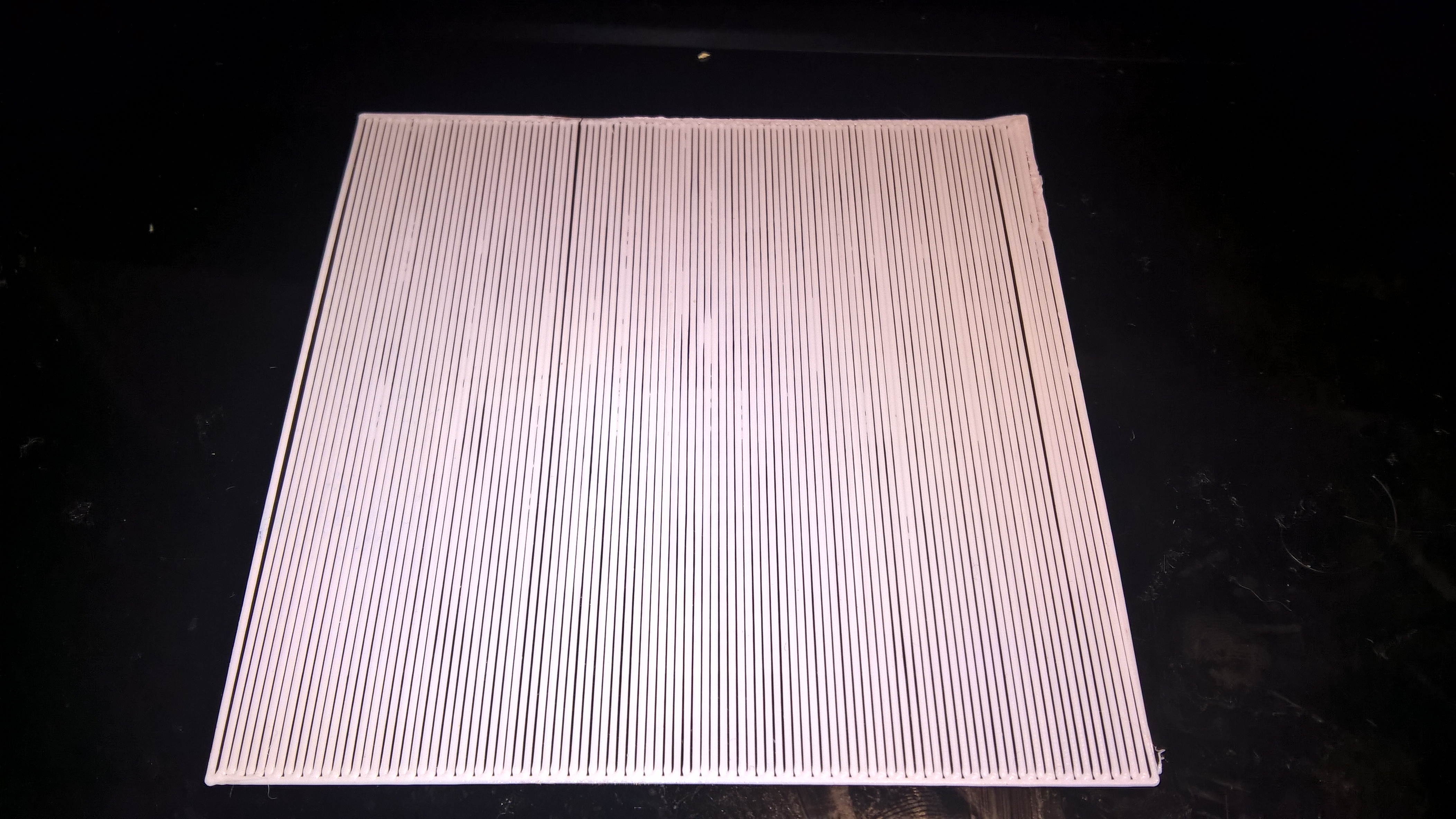Обращаем внимание на расстояние между линиями экструзии, оно должно быть равномерным по всей площади, по ним можно судить о наклоне стола (если один угол или сторону плющит больше других) или о неровности стола (если имеют место неравномерно расположенные участки с более сильным придавливанием).