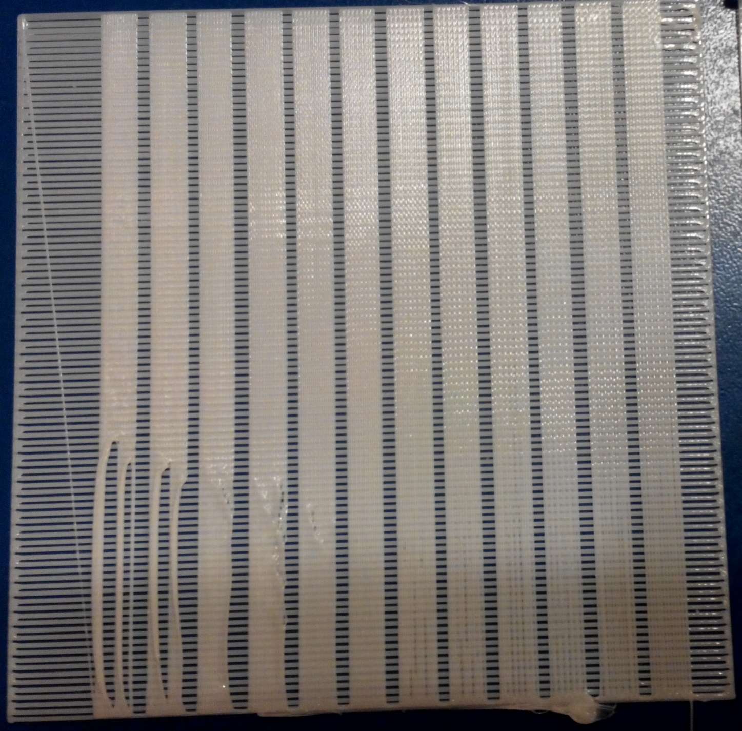 Обращаем внимание на расстояние между линиями экструзии, оно должно быть равномерным по всей площади, по ним можно судить о наклоне стола (если один угол или сторону плющит больше других) или о неровности стола (если имеют место неравномерно расположенные участки с более сильным придавливанием).