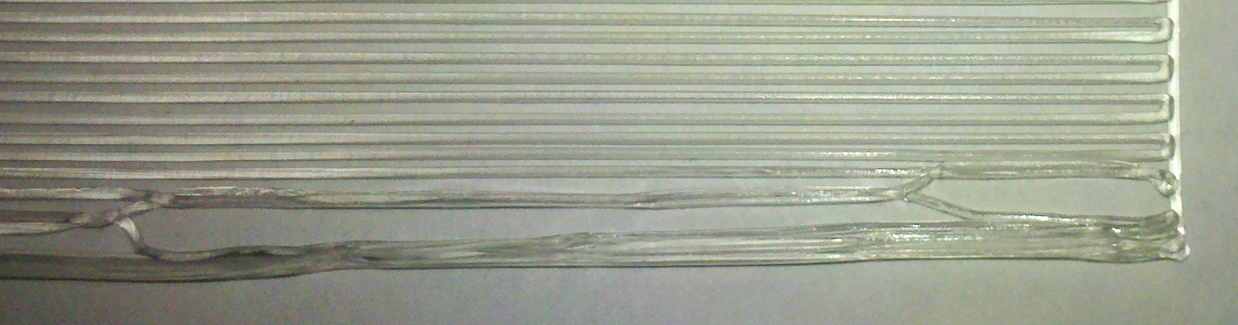 1)Raft_1_2.jpg. Первый и второй заход. Слипание первых трёх горизонтальных строк, пластик липнет и тянется за экструдером, далее всё нормализуется.