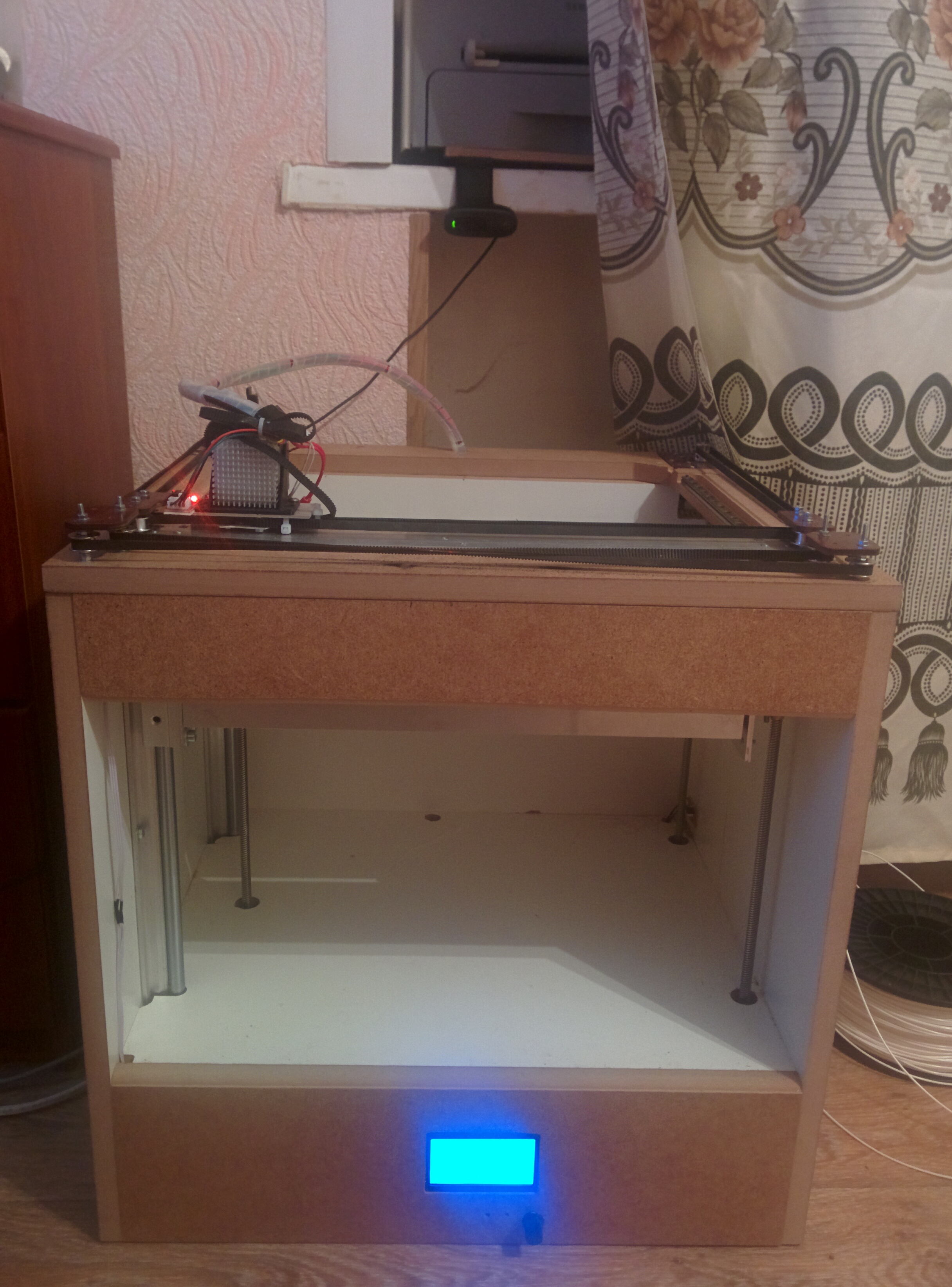 делал из того, что было под рукой - МДФ и ЧПУшный фрезер) Работа у меня такая. Думаю чего бы не использовать МДФПока наброски, после корпус переделывать буду. Скорее всего сделаю в виде тумбочки же, что бы на мебель похоже было, только пленкой обтянуть нужно. Сейчас придут TMC2100 для X и Y, придумать как и куда присобачить, как охлаждение сделать, что бы в корпусе отверстия для вентиляторов вырезать. Хочется драйвера выносными сделать и к хорошему радиатору прилепить с обдувом.
