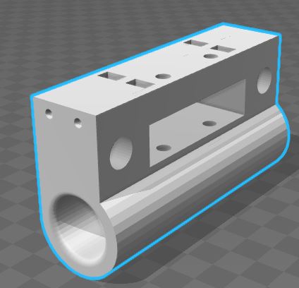 Печатать вертикально, чтоб гнездо под линейные подшипники было гарантированно круглым. Мелкие отверстия, включая под валы, пройти сверлом не проблема. Остается только перекрытие прямоугольного отверстия. Если мосты сильно провисают, то придется поддержки включить. Или я где то не прав? На прушу подобное крепление за раз печатается, никто на части не режет.