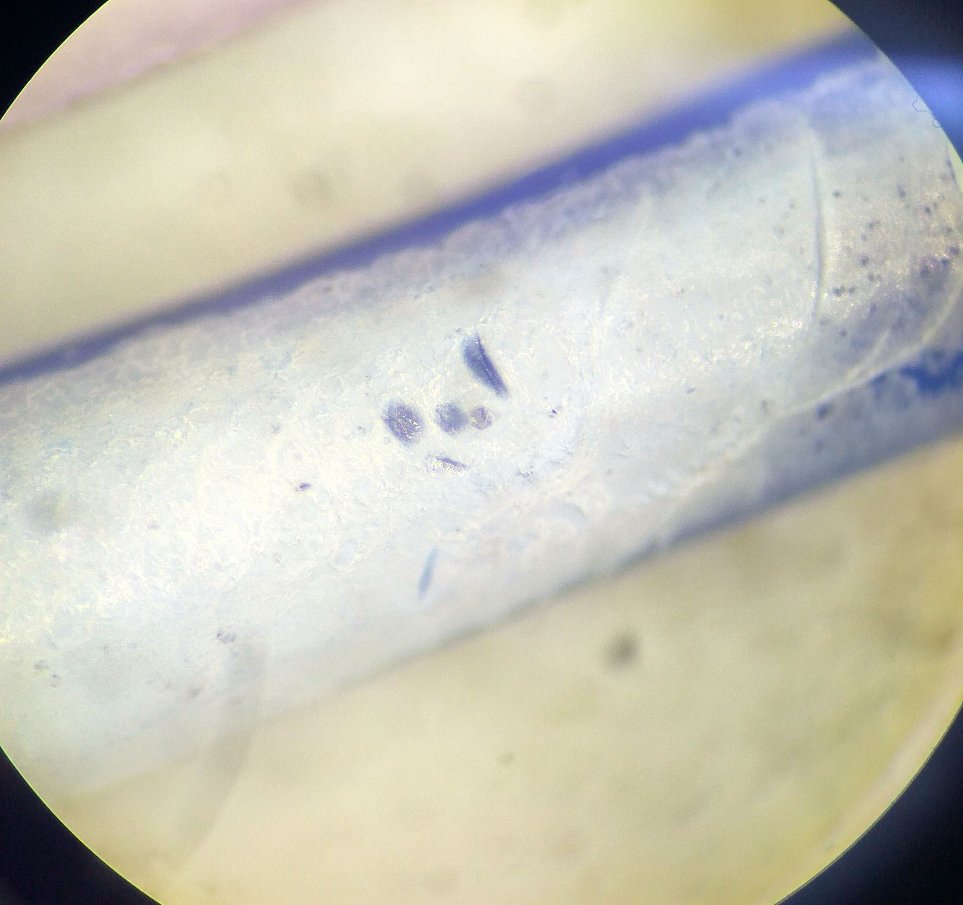 Он не стирается, не остается на пальцах или тряпочке, только заглаживается. Вот эти пятнышки на синем прутке под большим увеличением - это я слегка надавил кончиком пинцета. Налет при этом никуда не делся бы, так что, как я и писал, похоже что поверхность пластика приобретает пористую, "пенную" структуру