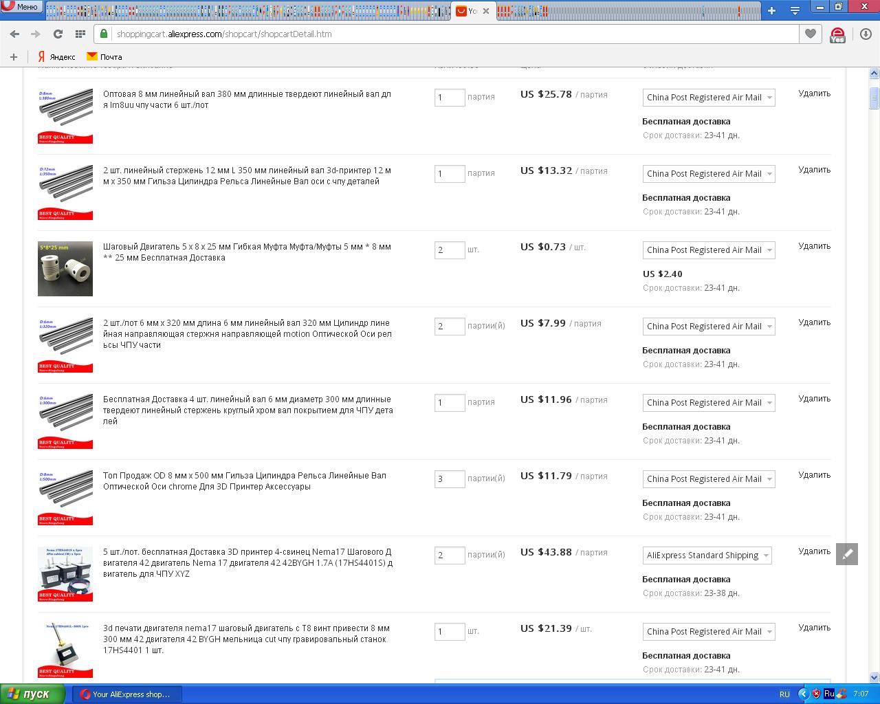 Я сейчас хочу собрать станок (типа CNC2020) и 2 принтера с разной кинематикой и соответственно нужны 3 рельсы и 12 цилиндрических направляющих + трапецеидальные винты. Хочу заказать это одним лотом, так как есть хоть какая-то гарантия, что при пересылке это все не согнется в бараний рог.