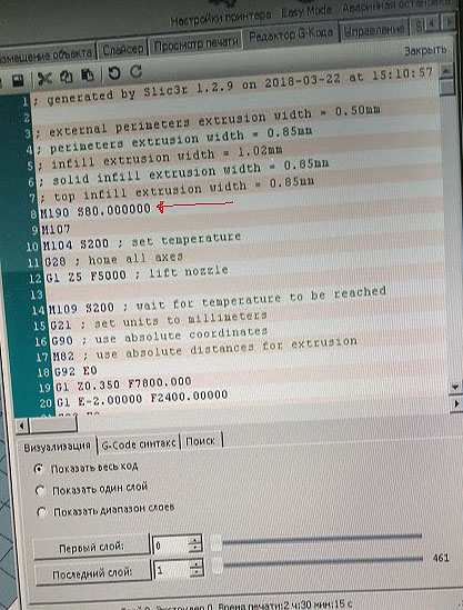 М190 S80 - как раз отправляется на принтер, этот код переводится на "человеческий" язык как "нагрей стол до 80 градусов, а пока не нагреется - жди" Но принтер читает этот код и думает "какой нафиг стол? не греется у меня стол, идите все лесом!" и ничего не делает, т.к. ему никто не разъяснил, что стол у него уже греется. Надеюсь, теперь понятно?