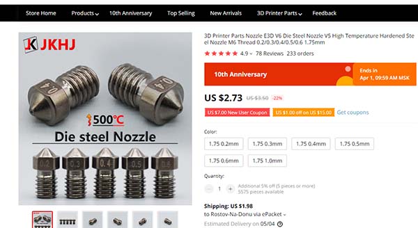 к примеру (если люди берут пластик с такими цениками, конечно можно и сапфировые хотя бы 0.2 пытаться найти). стальные, с покрытиями и т.д. сопла используют и под такие композитные пластики и под кучу других.