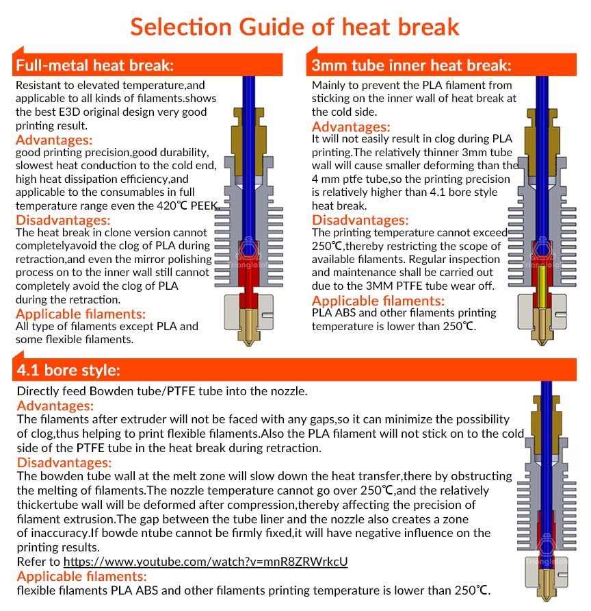 Я как раз таки рекомендую вариант All Metal, где трубка подачи останавливается в верхней части термобарьера а до сопла пруток идет по нержавейке (теплопроводность которой выше фторопласта, но ниже стали - поэтому тут нерж и используют). Контакт с нержавейкой активнее отводит тепло от столбика расплава, поднимающегося от сопла.
