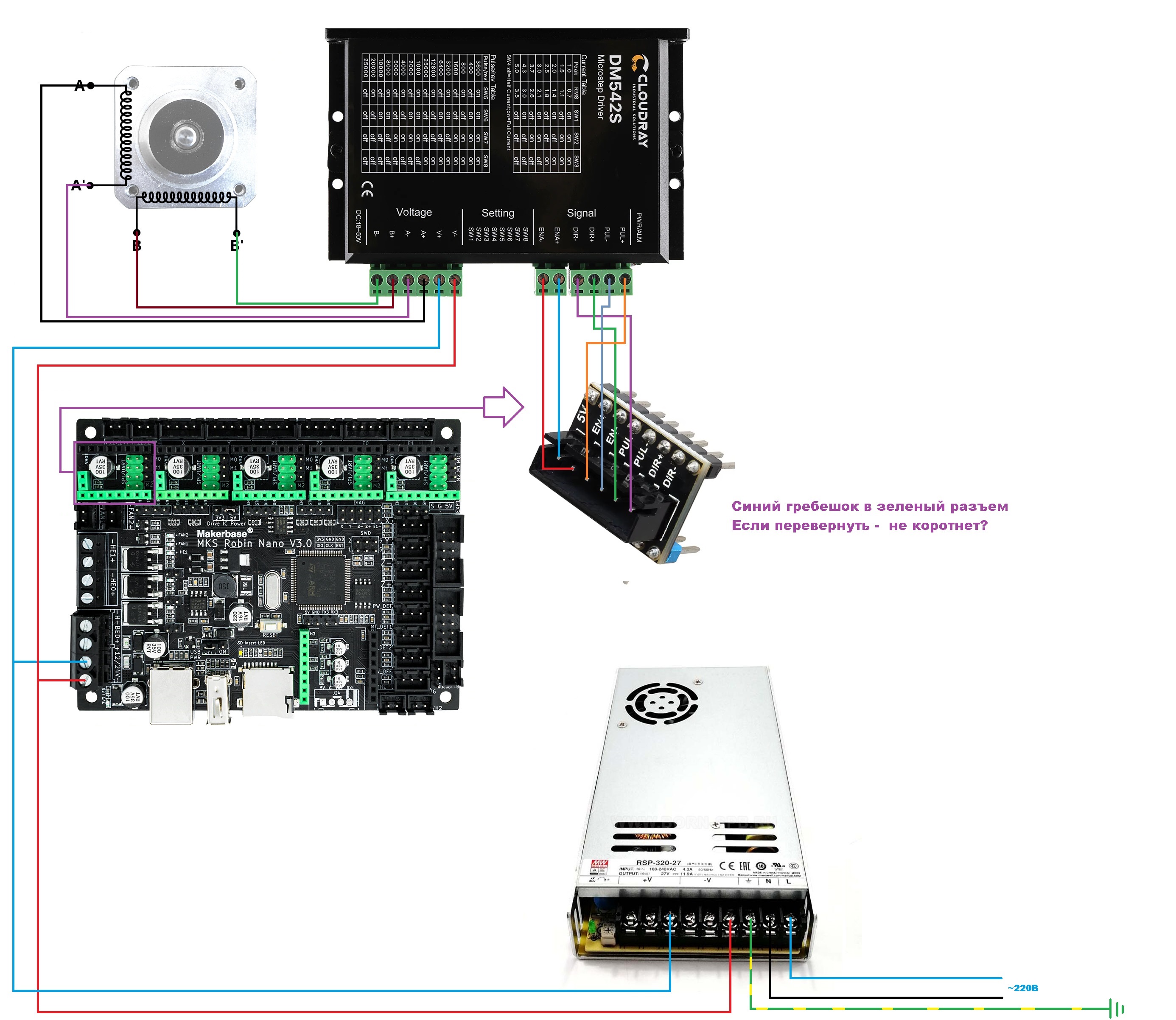 Есть плата mks robin nano v3.1 и драйвер dm542s, а также адаптер Lerdge, блок питания 24В и шаговый двигатель.