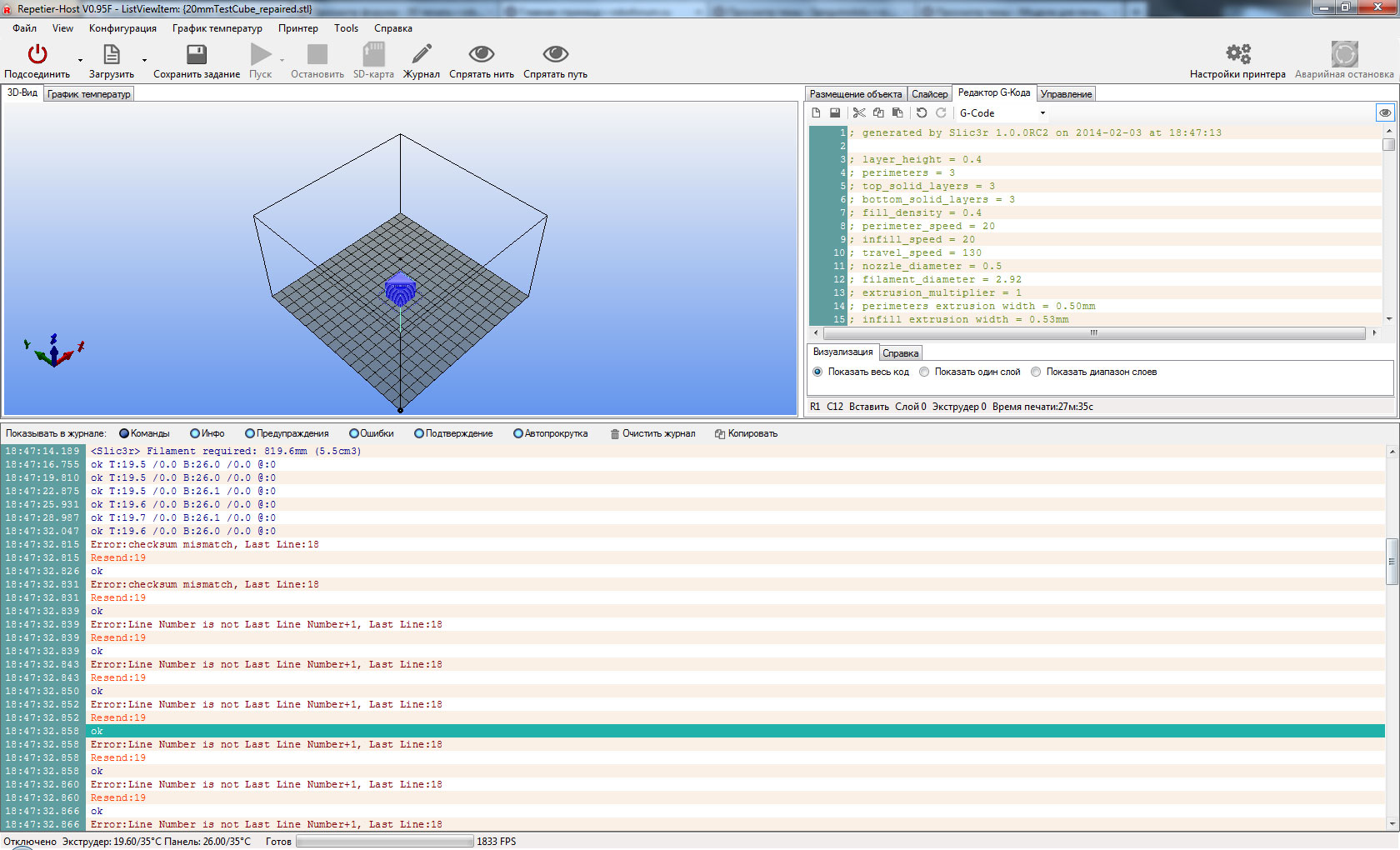2. При начале печати, программой Repetier-Host доходит до перемещения головки к месту печати и прога вылетает. Переустанавливал, не помогает. Причина не ясна. Все функции программы, двигать головой и т.п. работают...