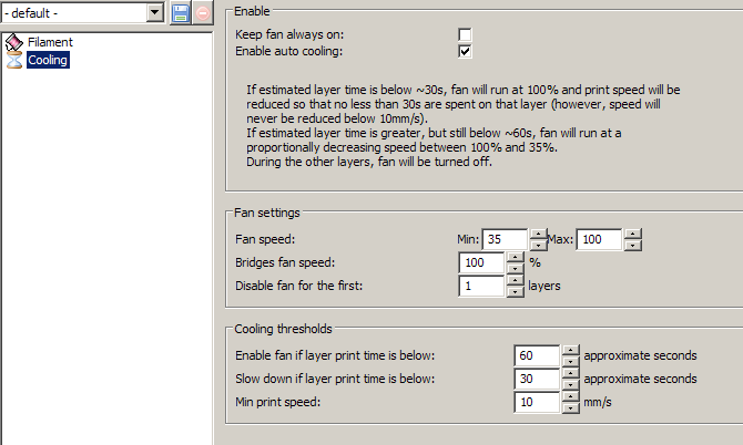 зайдите во вкладку cool и поставьте минимальное время слоя. я ставлю от 10 до 30. идею вашу считаю нежизнеспособной, лучше не отводите, а печатайте рядом цилиндр, иначе "соплями" основную печать испортите. уже читали http://fabmetheus.crsndoo.com/wiki/inde ... forge_Cool ? В принципе, я думаю, как вариант, отводить сможете с помощью команды замены пластика или с помощью пауз. Посоветую, бросить эту идею и делать как все, подбирайте настройки.Damir писал(а):А где в Skienforge есть настройки с помощью которых можно программно охлаждать модель?