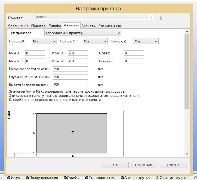 Добавлено спустя 1 час 37 минут 42 секунды:sap писал(а):sap, а у тебя геометрия стола в слайсере верно выставлена? Тут на форуме есть ссылки на CaliGator, попробуй им рафт напечатать, если уйдет дальше 100 мм - слайсер криво настроен.