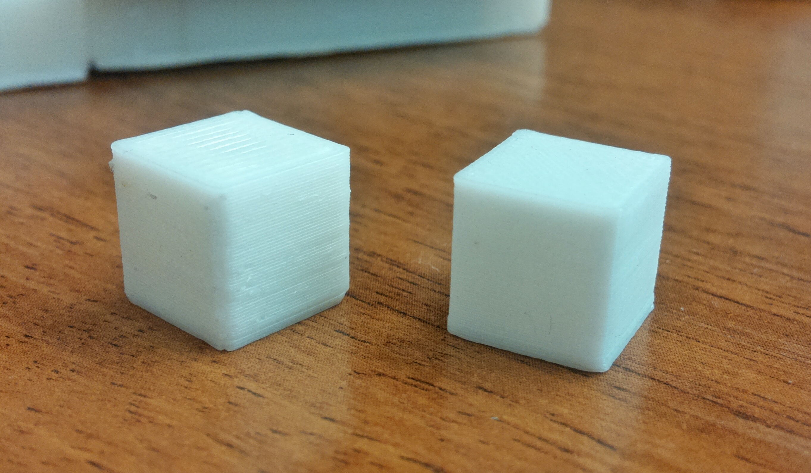 На фото кубик слева это напечатанный гранью в сторону оси z. По середине грани видно шов. Справа кубик напечатанный задней стороной к оси z. Справа видно на углу гребенку.