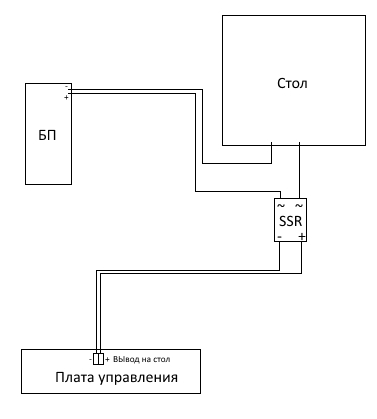 Нет. Релюшка подключается вместо стола (т.е. двумя проводами), в данном случае еще соблюдая полярность. Стол подключается одним проводом к БП напрямую, другим через силовые выводы реле (в разрыв).