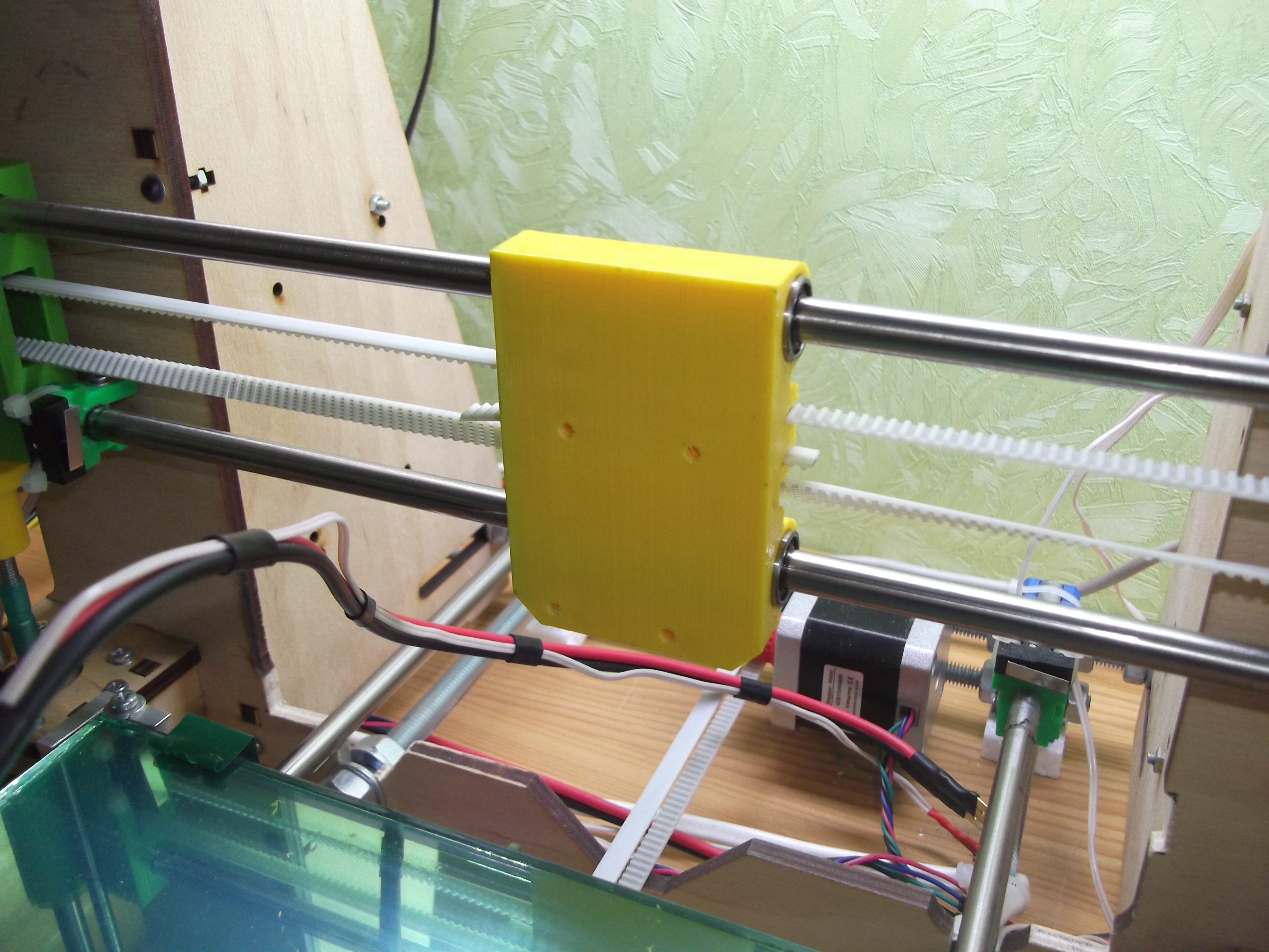 1. На каретке Х увеличил расстояние между прутками до 50 мм. Чем шире прутки тем меньше амплитуда раскачивания экструдера с соплом.