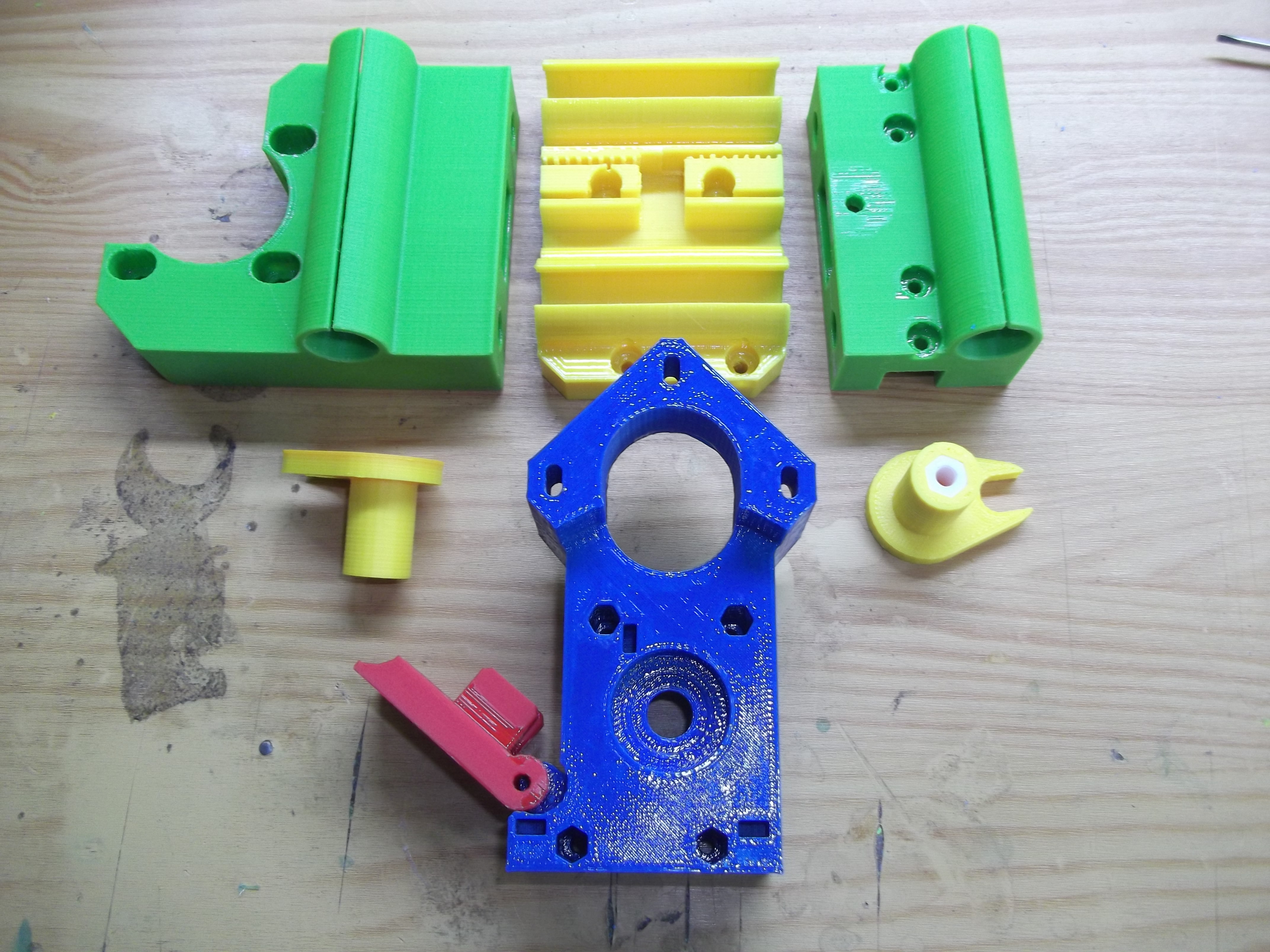 Я пробовал типа такого. У меня постоянно шестеренка с насечками откручивалась. Стопорный винт никак не спасал, постоянно разбалтывался и шестеренка начинала прокручивать. В конце концов я просверлил ось и шестеренку насквозь и вставил шпонку 1,5 мм каленую. Так у меня со временем эту шпонку перемололо пополам. В общем не удачная конструкция. Для проталкивания прутка 3 мм, нужна огромная сила и стопорные винты не выдерживают.