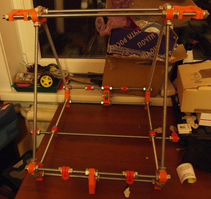 Принтер у меня получается слегка больше того что делают обычно (треугольники на 70мм длиннее, ширина тоже ~на 70мм) больше на М10 шпильках и 10-х валах ( не хотелось укорачивать 4 500мм вала и 2 400мм вала), но hotbed для начала точно будет стандартный 20см - он у меня уже есть. на данный момент уже собран каркас завтра планирую собрать ось X пока без двигателя привода...